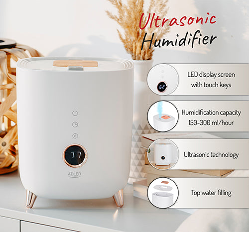 "Adler Hvid Ultrasonisk Luftfugter" er den perfekte løsning til at opretholde en behagelig luftfugtighed i dit hjem. Med intelligent styring, stor vandkapacitet og praktiske funktioner som aromaterapi og timer, er denne luftfugter ideel til at skabe et sundt og behageligt indeklima året rundt.