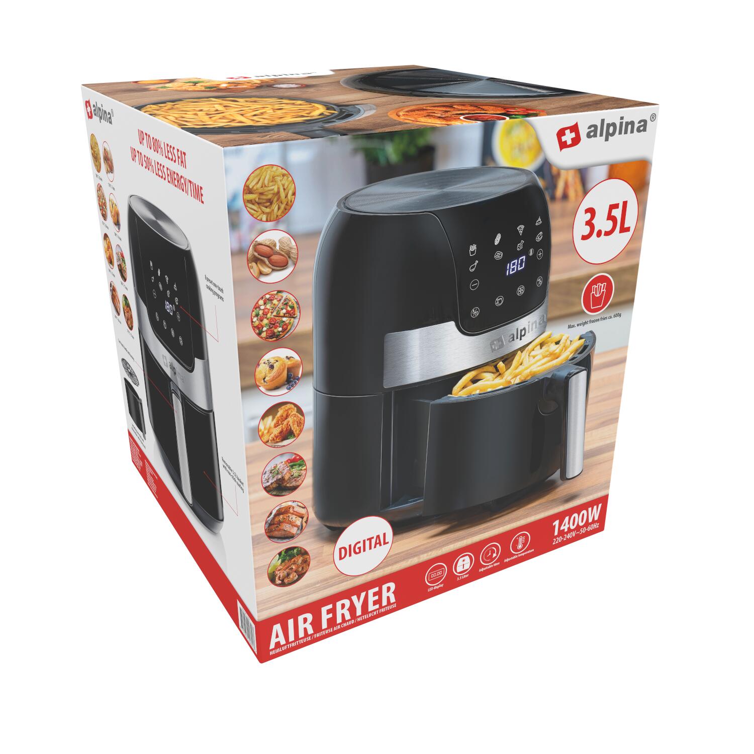Alpina airfryer gør madlavning enklere og sundere. Med en effekt på 1400 watt kan denne airfryer hurtigt og jævnt tilberede forskellige retter. Den rummelige kapacitet på 3,5 liter gør det nemt at lave måltider til hele familien i denne varmluftsovn.
