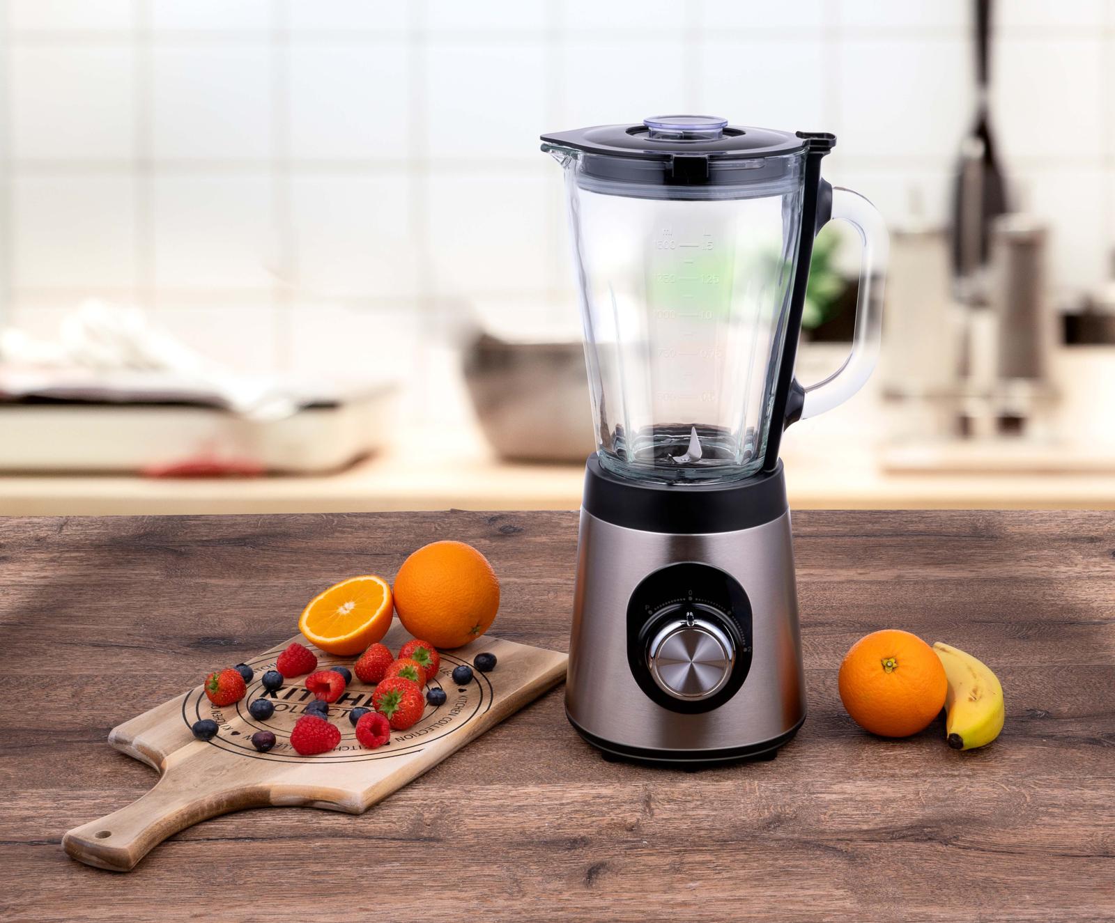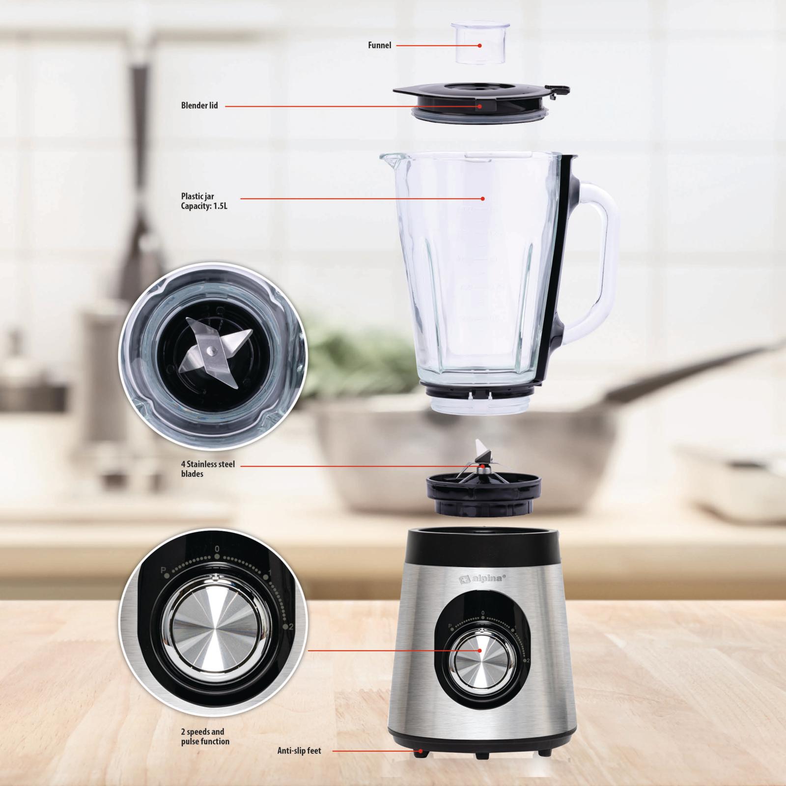 Denne Alpina blender med en kapacitet på 1,5 liter bør ikke mangle i dit køkken. Smoothie makerens glasbeholder og robuste rustfri stål bund, inklusive skridsikre fødder, gør blenderen stabil og holdbar, så du kan nyde godt af den i mange år. Smoothie blenderen har 2 hastigheder og en pulserende funktion, så du altid kan opnå den perfekte konsistens til smoothies, supper og saucer. Blenderen er BPA-fri, og låget og glasbeholderen tåler opvaskemaskine, hvilket gør oprydning og rengøring til en leg.