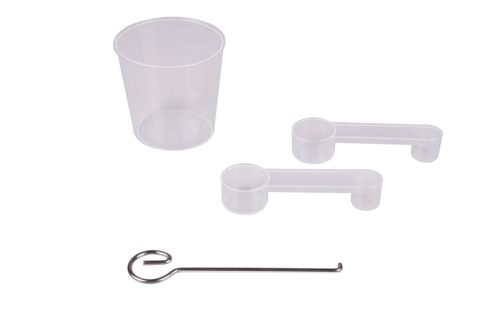Inkluderer målebæger, ske og fjernelsesværktøj