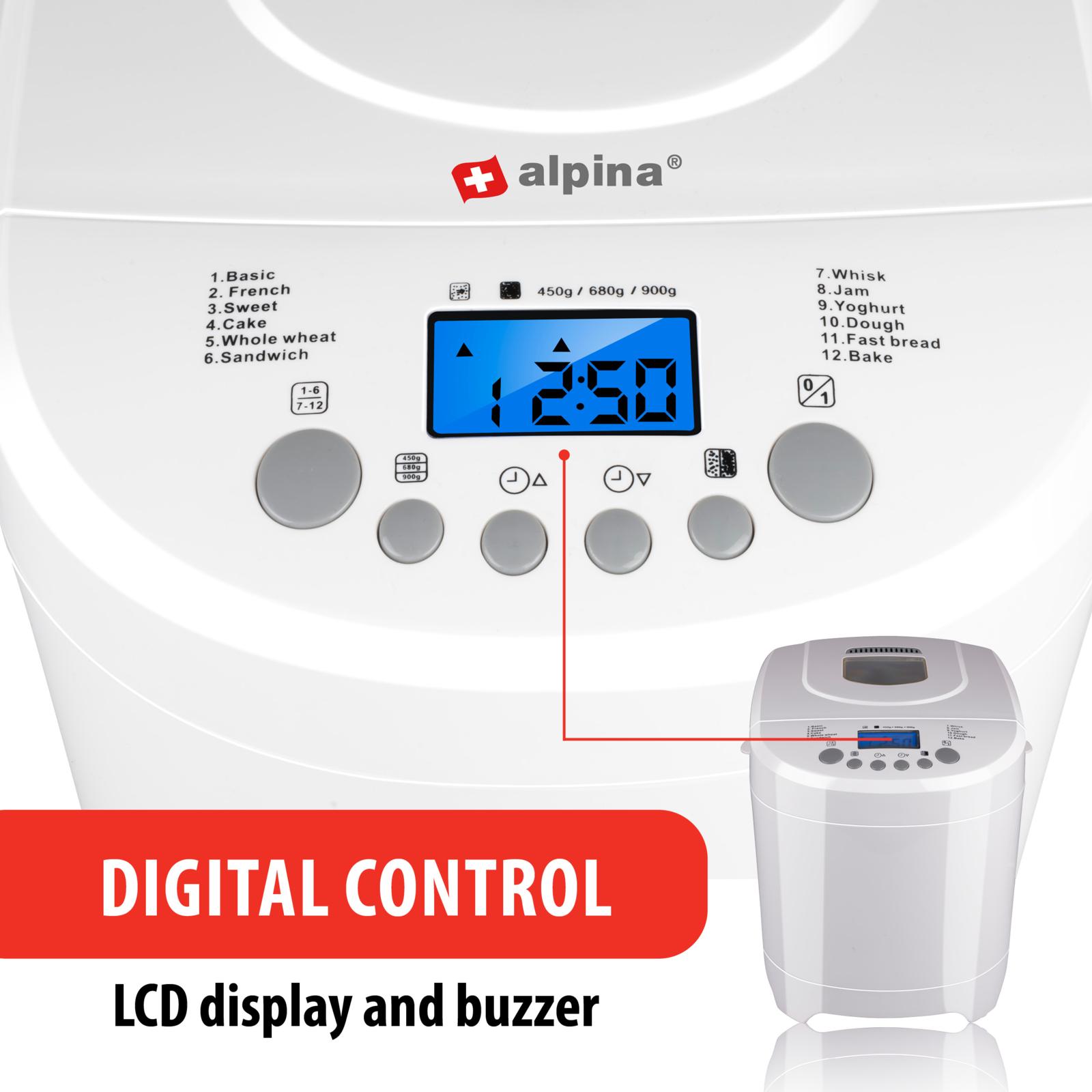 Alpina brødmaskine med display er en praktisk tilføjelse til dit køkken. Med en kapacitet på 2 liter kan du bage lækkert frisk brød til hele familien. Brødmaskinen er udstyret med skridsikre fødd. . .
