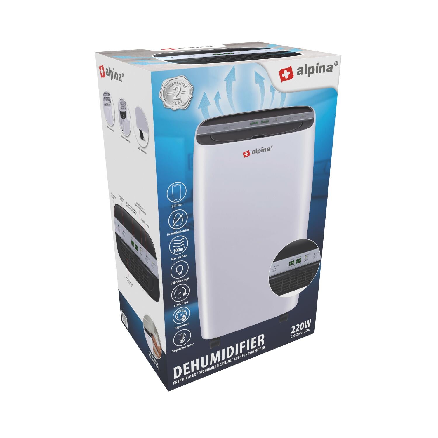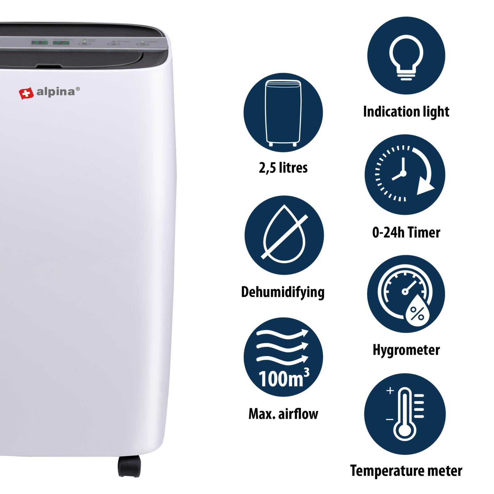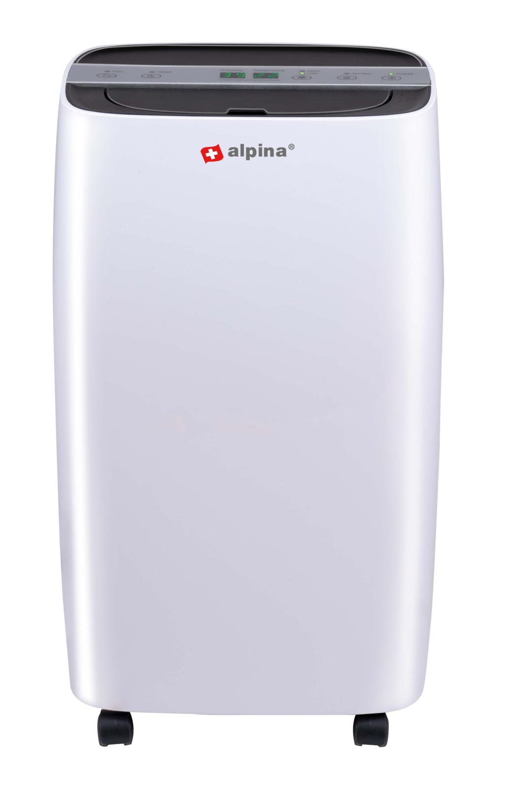 Alpina luftaffugteren er udstyret med en kraftig ventilator, der kan justeres i hastighed, hvilket gør den i stand til at regulere luftfugtigheden i rum op til 100 m³. Den fjerner op til 10 liter fugt om dagen, som opbevares i en 2,5 liters vandtank. Når tanken er fuld, lyser en indikator på displayet, og enheden slukker automatisk for at forhindre overløb.