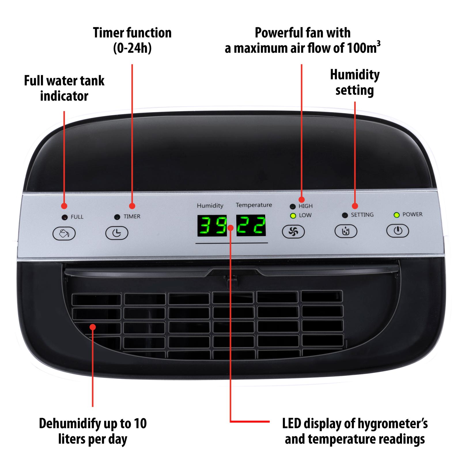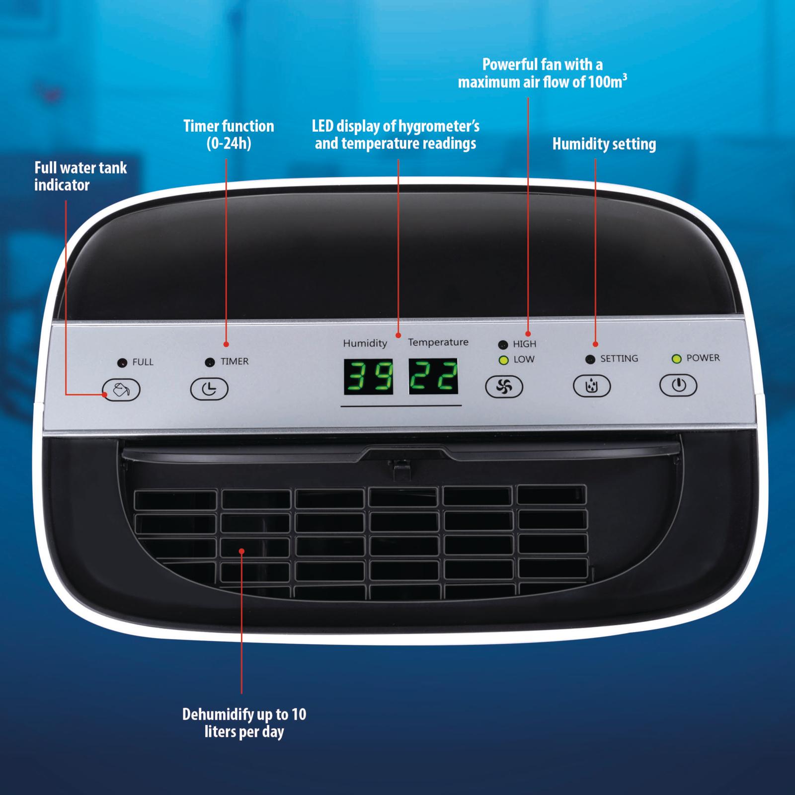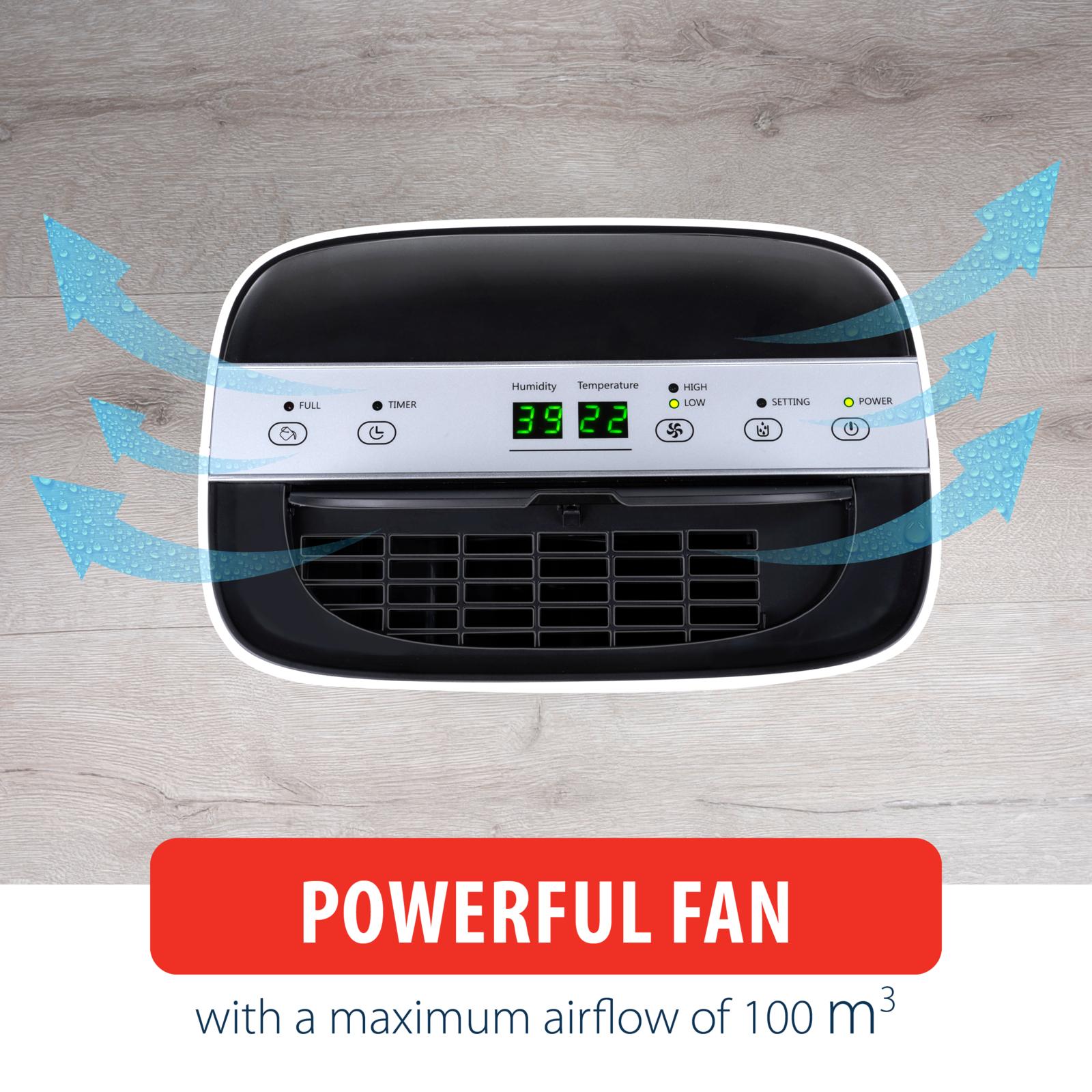 Alpina luftaffugteren er udstyret med en kraftig ventilator, der kan justeres i hastighed, hvilket gør den i stand til at regulere luftfugtigheden i rum op til 100 m³. Den fjerner op til 10 liter fugt om dagen, som opbevares i en 2,5 liters vandtank. Når tanken er fuld, lyser en indikator på displayet, og enheden slukker automatisk for at forhindre overløb.