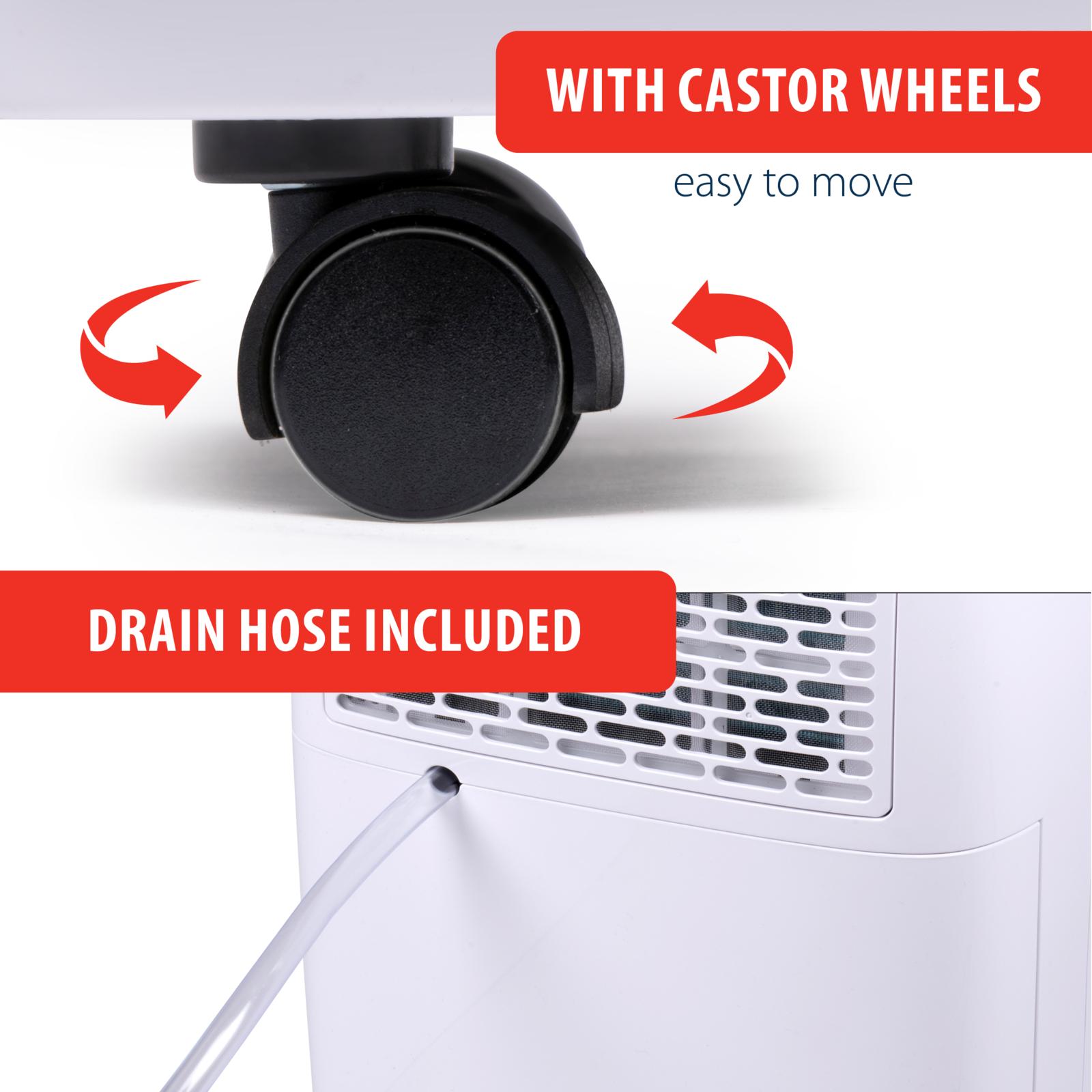 Med et lavt støjniveau på kun 46 dB er denne luftaffugter ideel til brug i soveværelser, stuer og kontorer, uden at forstyrre din nattesøvn eller daglige rutine. Takket være hjulene kan enheden nemt flyttes fra rum til rum, alt efter hvor behovet er størst.