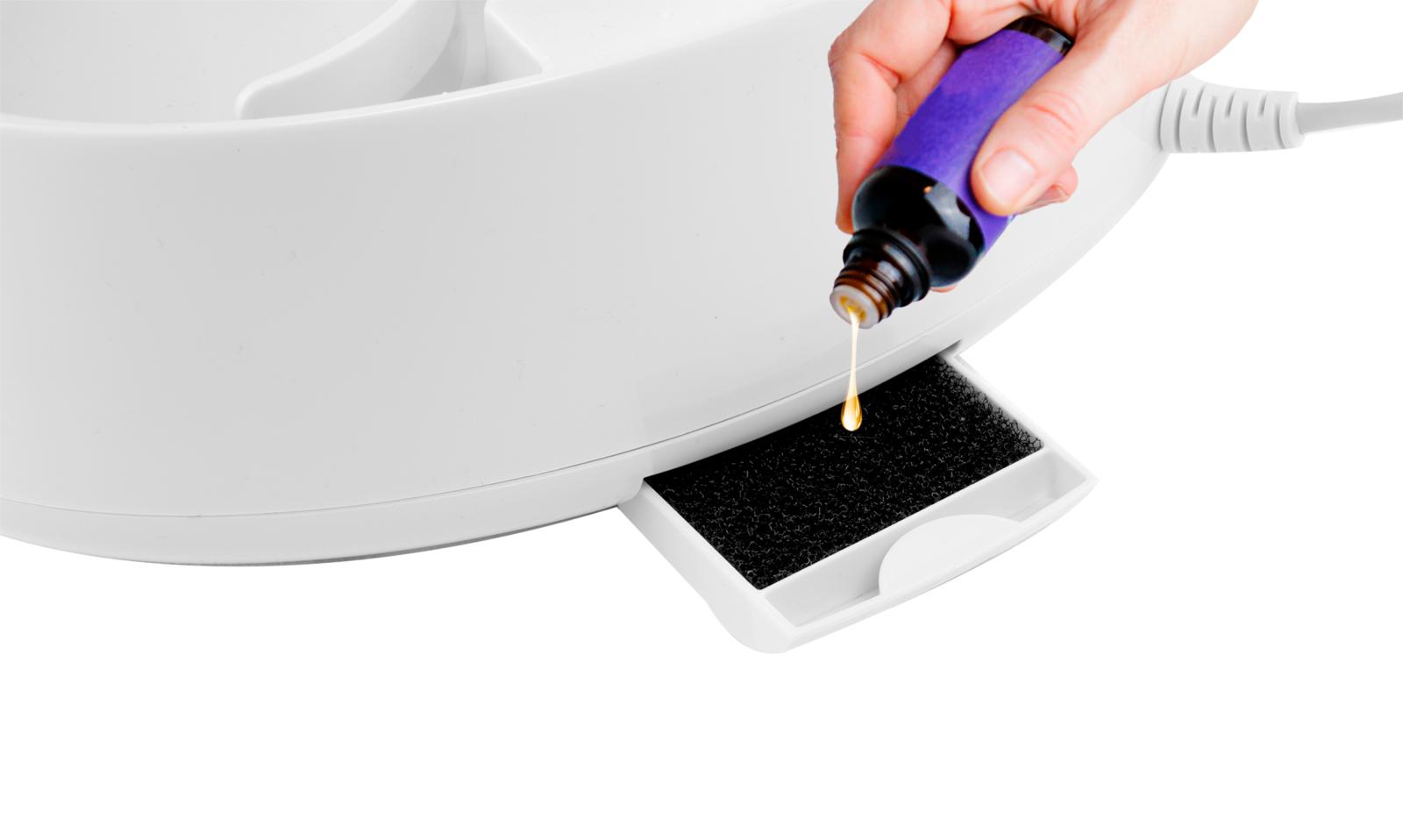 Vil du skabe en ekstra behagelig stemning? Tilsæt blot 3-5 dråber æterisk olie til aroma-beholderen i bunden af enheden. På den måde kan du kombinere frisk luft med din yndlingsduft.