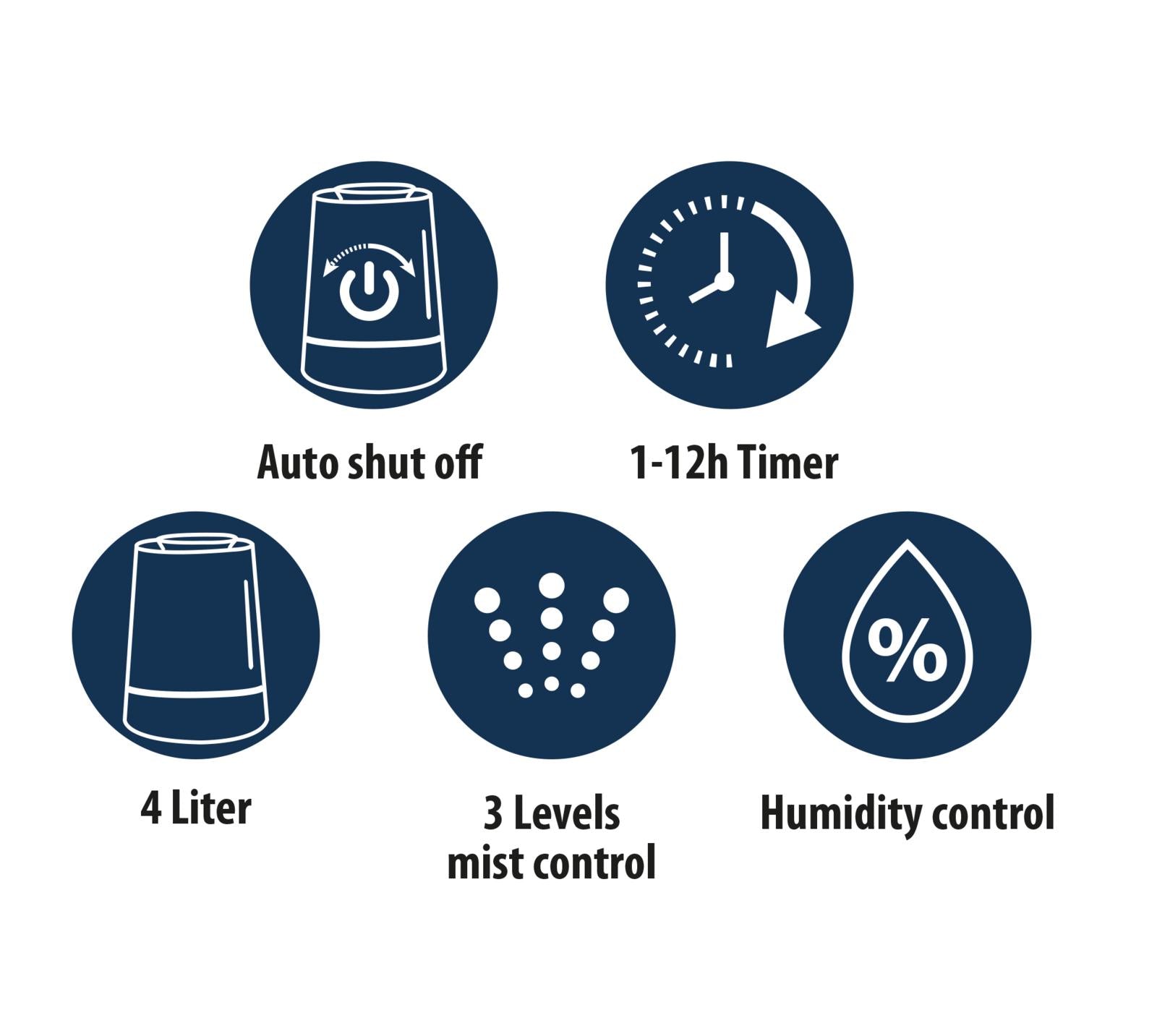 Luftfugteren kan betjenes via LED-displayet eller med den medfølgende fjernbetjening, hvilket gør den nem at bruge fra sofaen eller sengen. Den er også ideel til soveværelset, da den har en indbygget natlampe, en timer (1-12 timer) og en særlig "sleep mode", der dæmper displaylyset.