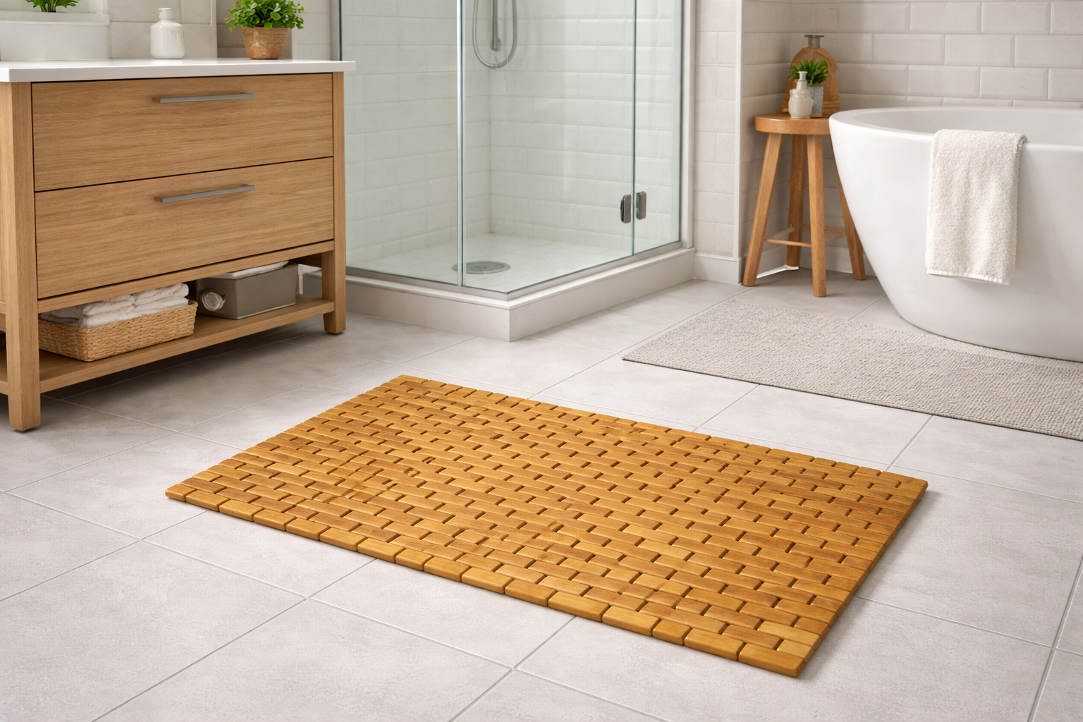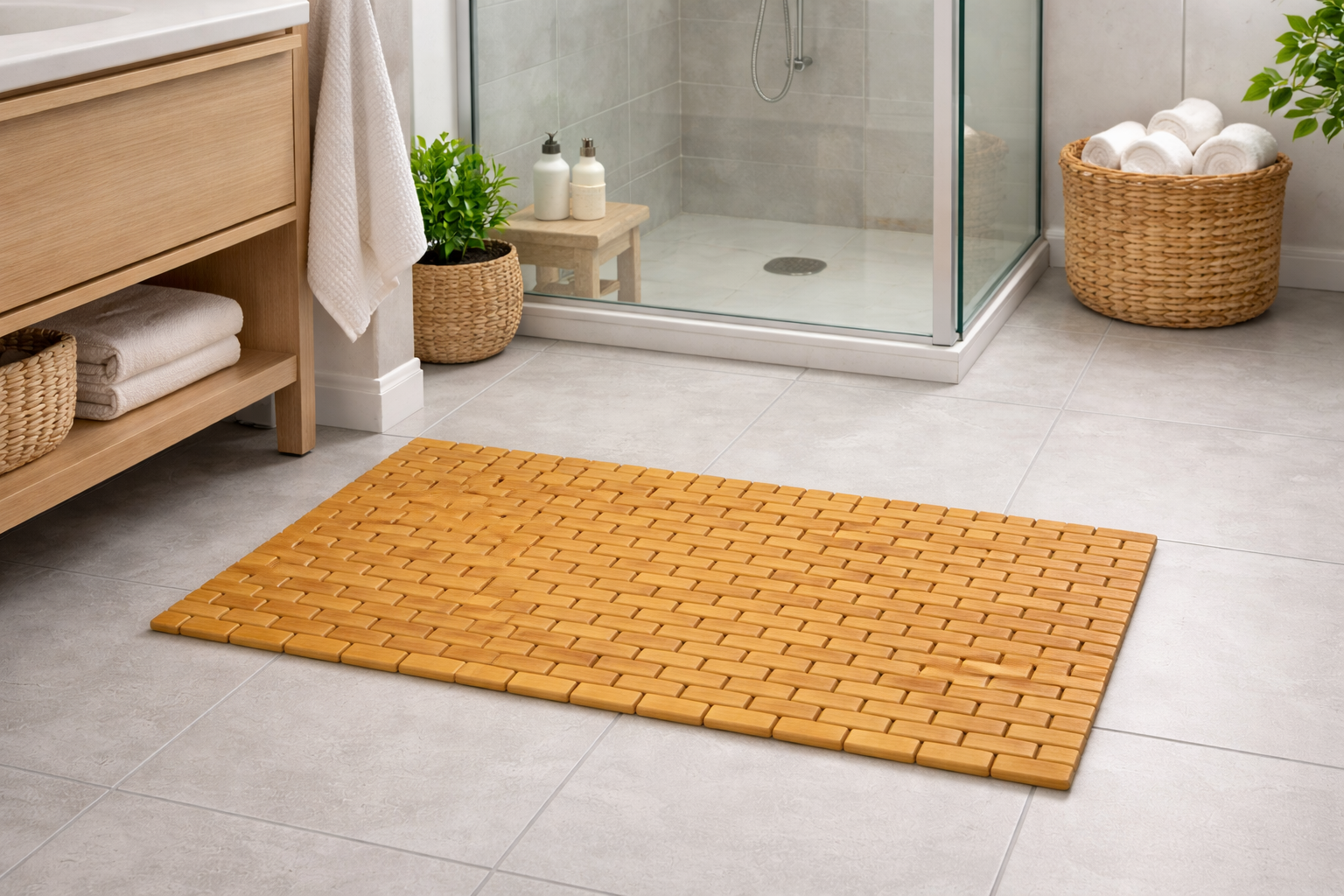 Tilføj naturlig elegance og funktionel komfort til dit badeværelse med en bambus bademåtte. Lavet af ægte bambuslameller og udstyret med skridsikre EVA-fødder, giver denne måtte et solidt, sikkert og hurtigtørrende underlag foran bruseren eller håndvasken. En perfekt kombination af stil og praktisk anvendelse – hver dag.