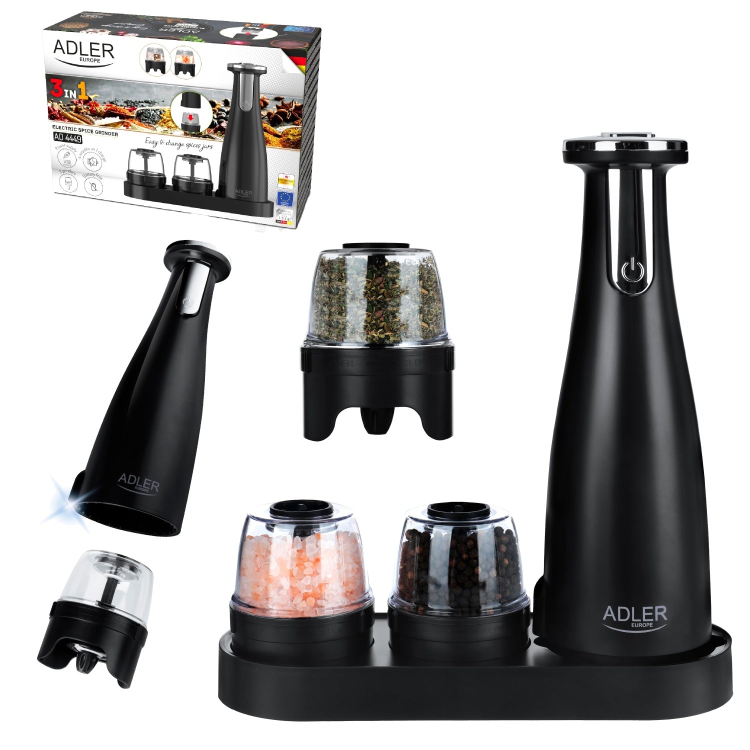 Elektrisk krydderikværnsæt med 3 kværne og justérbar Malingsgrad – USB Opladning
