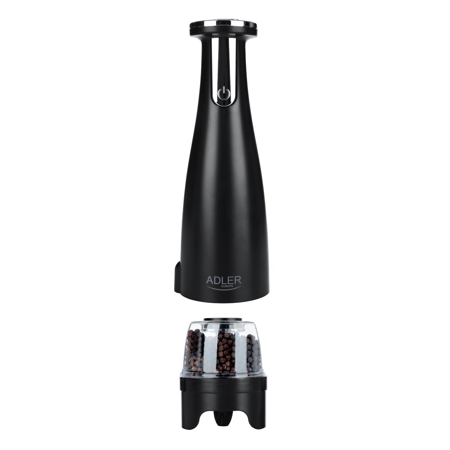 En indbygget lampe under kværnen lyser op under brug, så du nemt kan se, hvor meget krydderi du tilsætter. Den store krom-knap gør kværnen intuitiv og nem at bruge – også med én hånd.