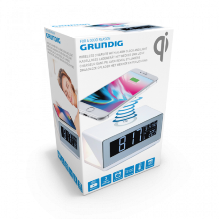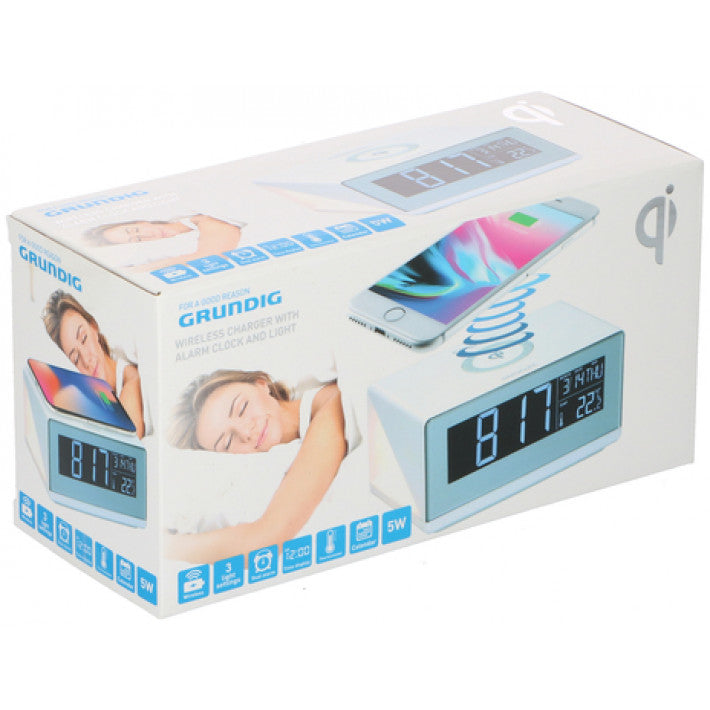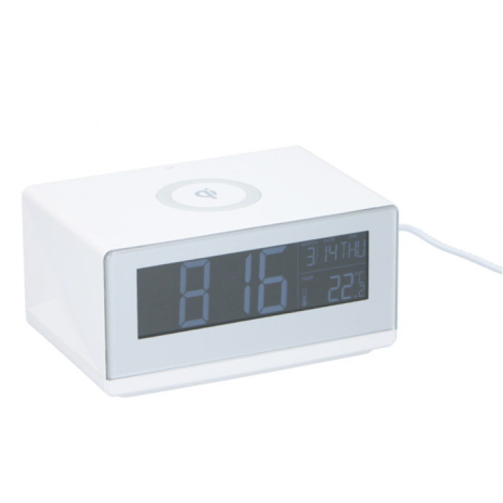 Et multifunktionelt digitalt vækkeur, der viser tid, dato, temperatur med klare og tydeligt LED-lys. Stor LCD-skærm viser tid, data, temperatur tydeligt. Du skal blot placere din smartphone oven på uret, og den begynder automatisk at oplade. Den har et natlys der kan dæmpes og alarm med snooze.