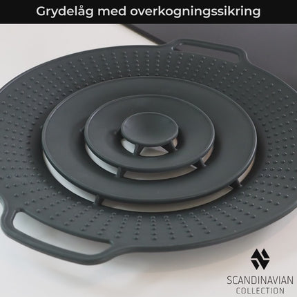 Introducerer det ultimative grydelåg til dit køkken: Det innovative grydelåg med overkogningssikring og fremstillet af førsteklasses silikone i høj kvalitet. Oplev en ny standard inden for madlavnings sikkerhed og praktisk design med dette fantastiske produkt, der er tilgængeligt i to elegante farver - lysegrå og mørkegrå.