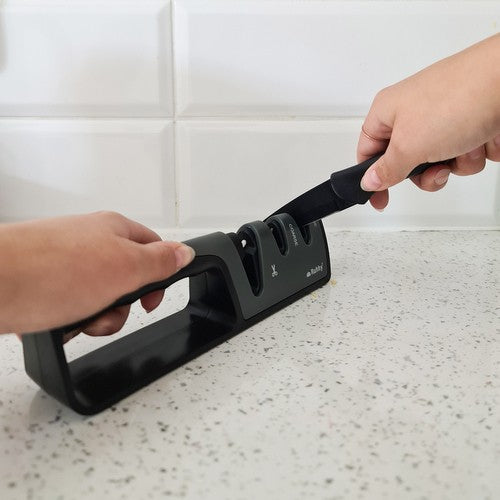Dette værktøj er kompakt i størrelse og kan nemt gemmes i enhver skuffe eller køkkenskab, når det ikke er i brug. Med et design i sort og grå, vil denne skærper passe elegant ind i enhver køkkenindretning.