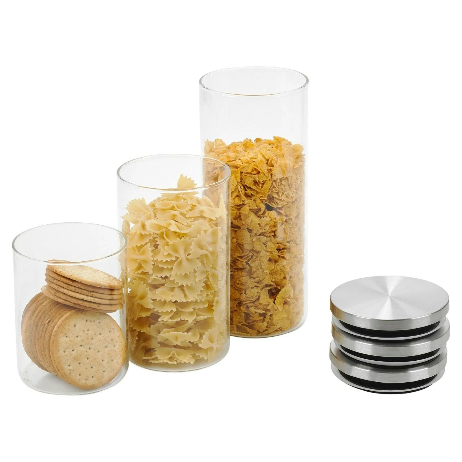 Super flot sæt med 3 opbevaringskrukker med låg i 3 størrelser. Glassene er udført i et enkelt og lækkert tidsløst design, så det passer ind i de fleste hjem. Glassene kan godt gå i opvaskemaskinen – Det anbefales dog ikke at vaske lågene i opvaskemaskinen.
