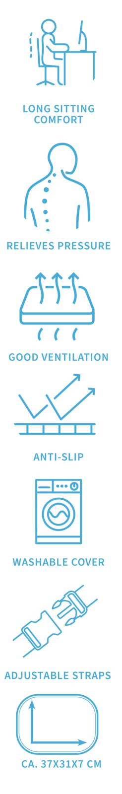 Denne pude er ideel til at skåne lænd og rygsøjle, hvilket gør den velegnet ved rygsmerter og lindring af iskias. Den er særligt gavnlig for dem, der sidder meget ned i løbet af dagen, herunder gravide.
