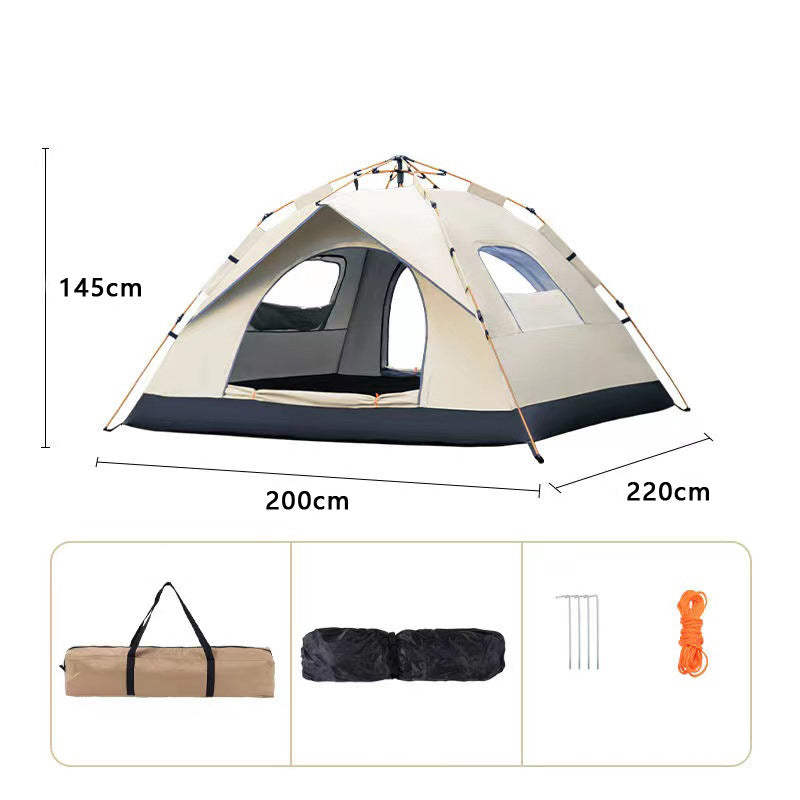Med målene 220 x 200 x 140 cm (udvendige mål) giver teltet god plads til 3-4 personer. Det er lavet i slidstærkt 210D Oxford-stof med stærke fiberglasstænger – både let og holdbart.