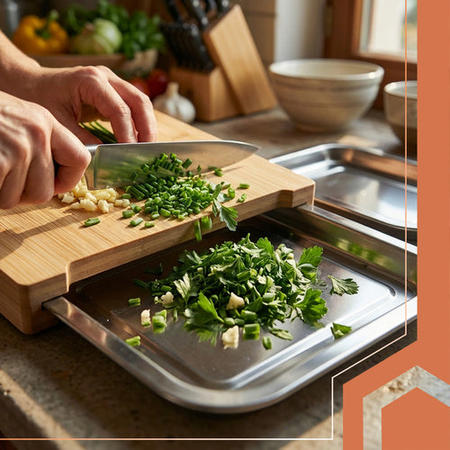 🧺 2 Udtrækkelige Beholdere i Rustfrit Stål Skub hurtigt hakkede grøntsager eller madrester direkte i de medfølgende beholdere. Perfekt til at holde arbejdsområdet ryddeligt og til nem transport af ingredienser direkte til gryden eller ovnen.