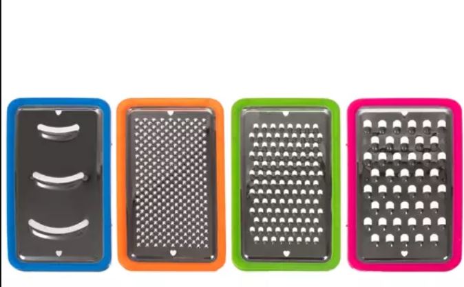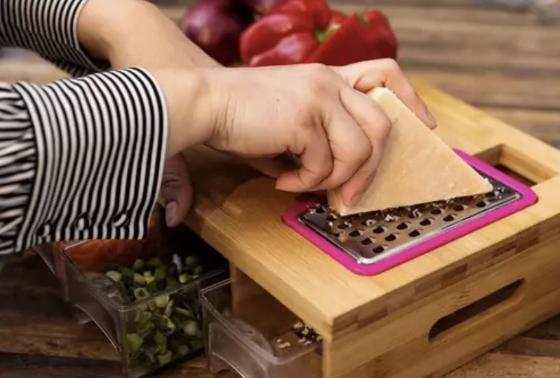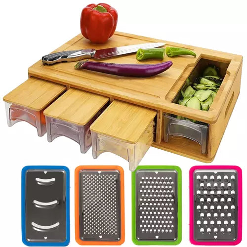 4 rivejern- brættet haren speciel fordybning til rivejernetgiver mulighed for nem og hurtig rivning af forskellige ingredienser direkte på brættet,alt falder direkte i skraldespanden.Sættet indeholder 4 forskellige tykkelser rivejern til forskellige formål.