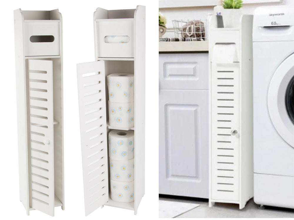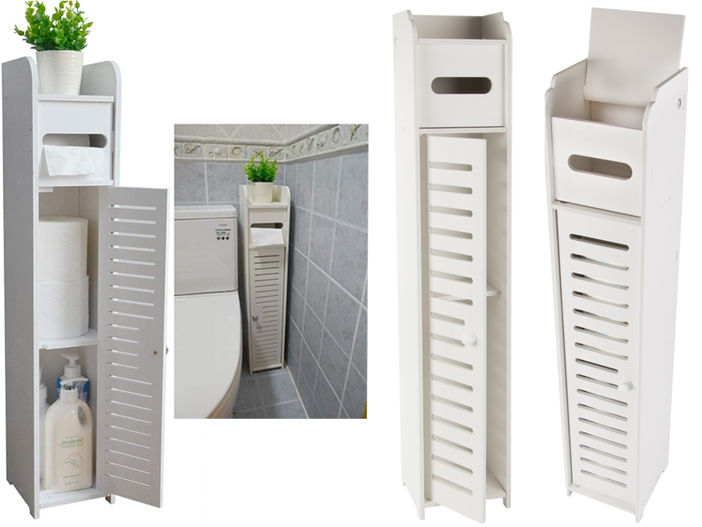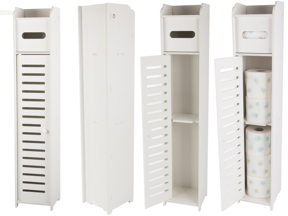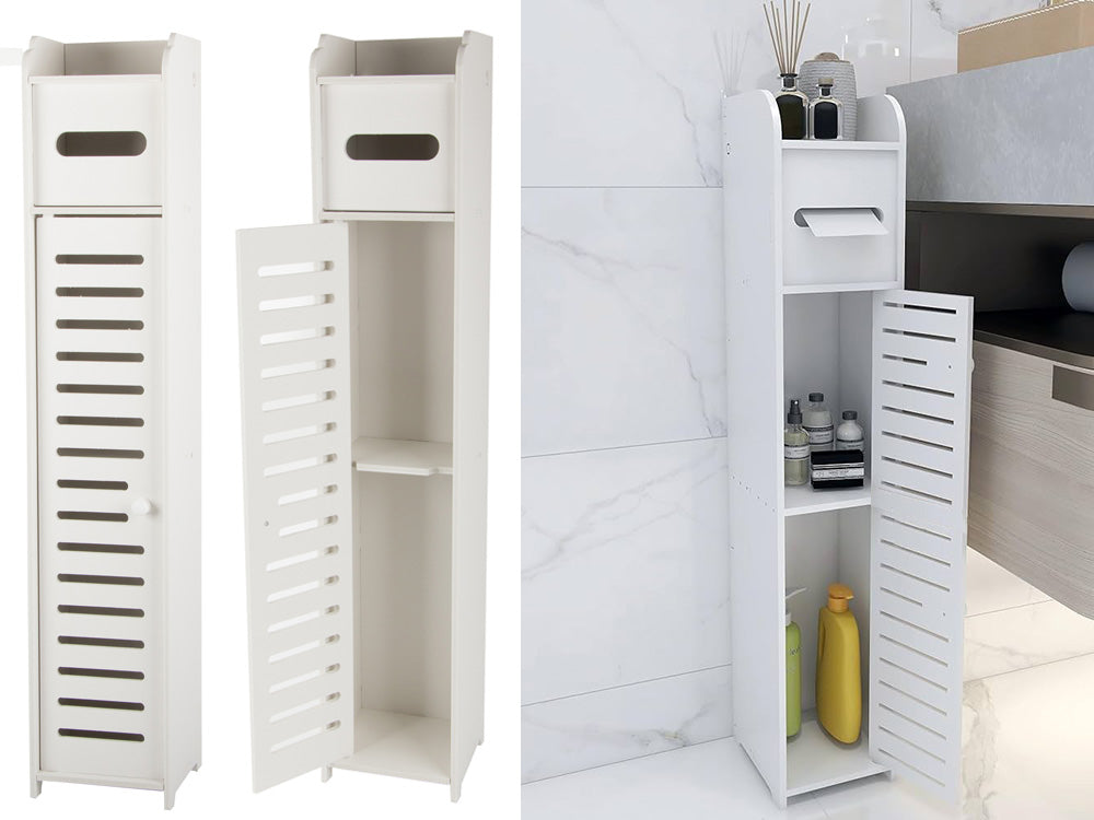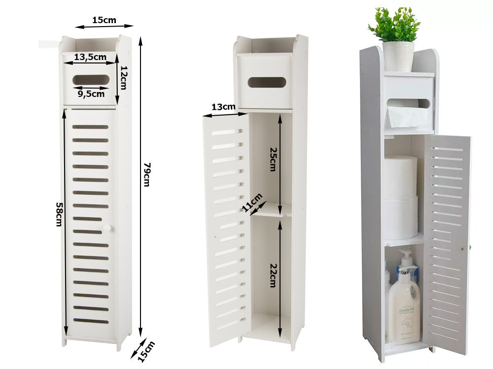 Det slanke design gør det nemt at placere skabet i selv de mindste hjørner. De rummelige hylder giver plads til opbevaring af kosmetik, toiletpapir og andre småting, mens den øverste hylde kan bruges til dekorationer eller planter.