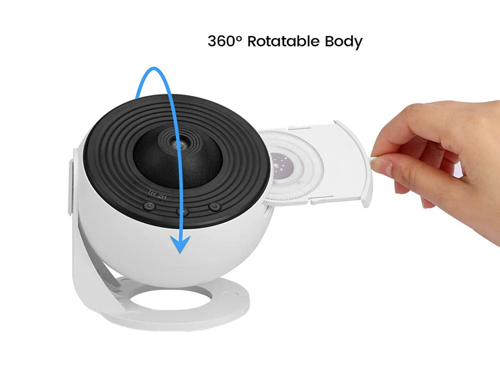 Den roterer 360 grader og kan projicere på både vægge og loft. Tre enkle knapper gør det let at styre timer, hastighed og projektion.