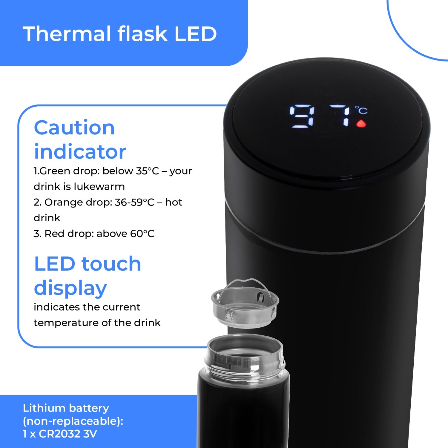 Hold styr på temperaturen på din yndlingsdrik med denne smarte termoflaske med LED touch display. Med et enkelt tryk kan du se den aktuelle temperatur på indholdet og dermed undgå både brændte tunge og kedelige, lunkne slurke. Perfekt til kaffeelskere, te-entusiaster og alle, der ønsker maksimal komfort i en travl hverdag.