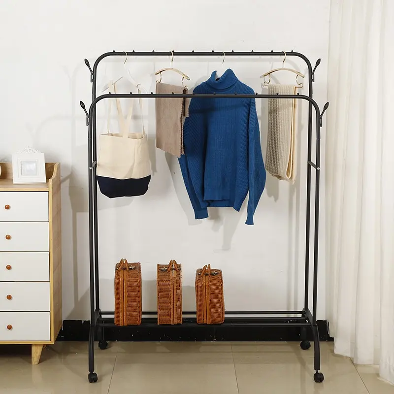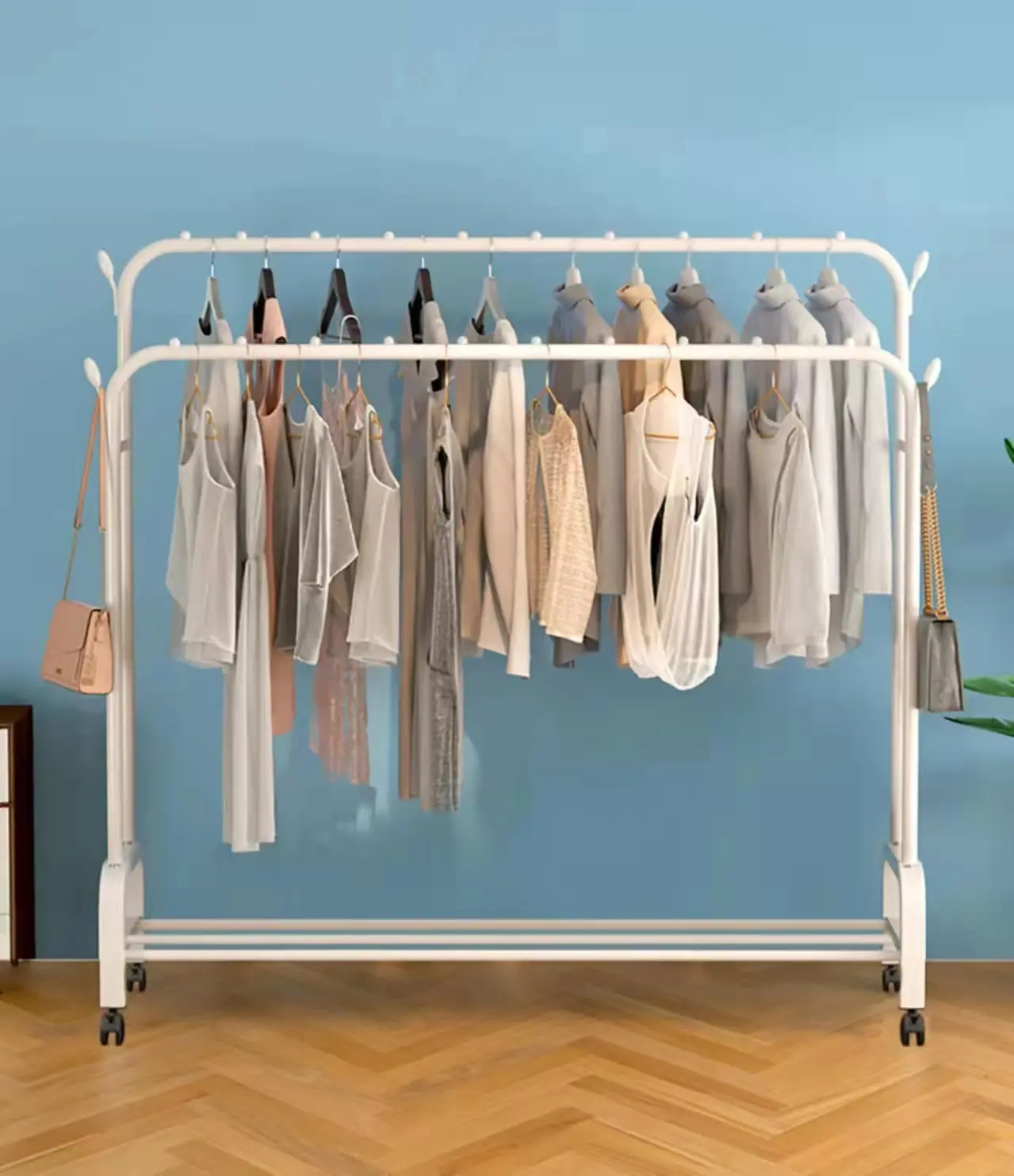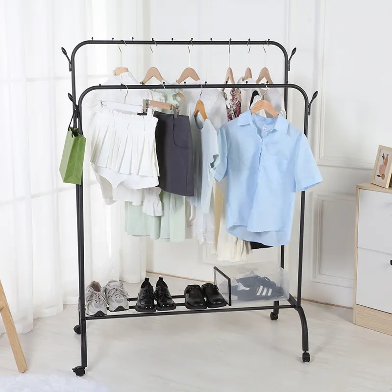 👚 Smart og Fleksibel Opbevaring Med en rummelig bøjlestang og en praktisk bundhylde giver stativet dig plads til både hængende tøj og sko, kasser eller tasker. Ideelt til både daglig brug og gæsteværelset.