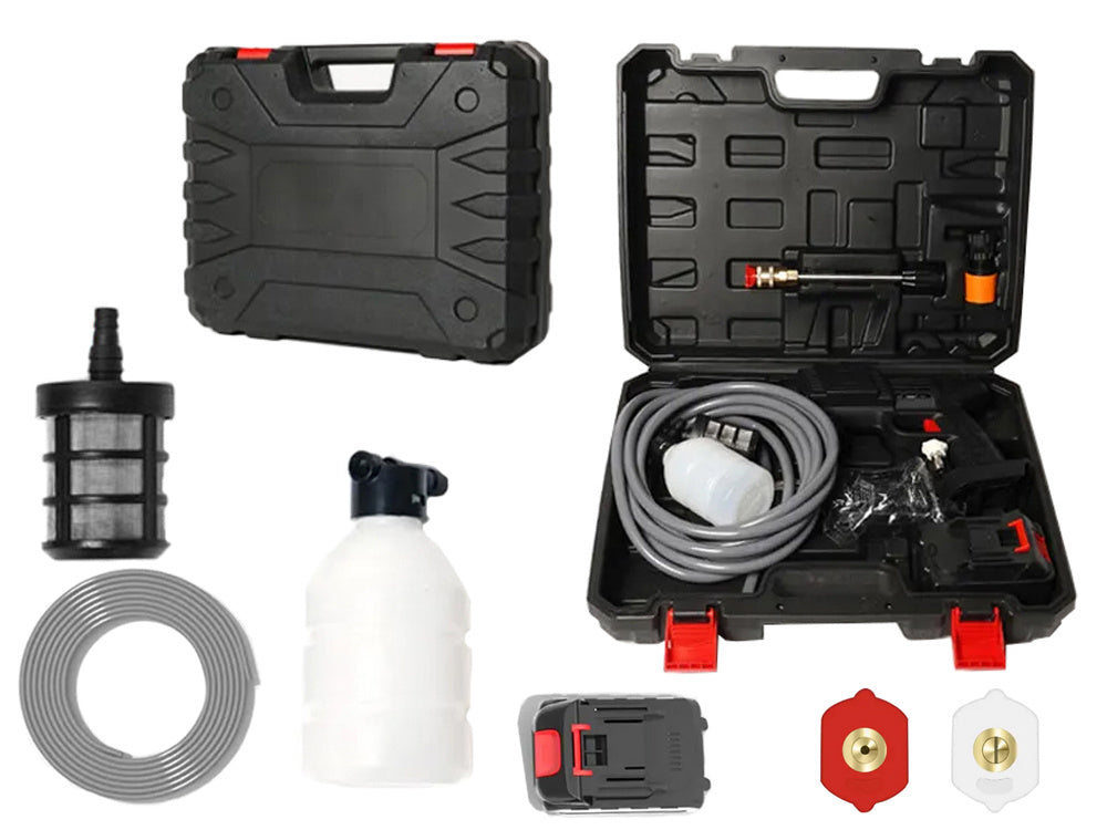 📦 Komplet Sæt med Tilbehør Højtryksrenseren kommer med et væld af tilbehør, herunder to dyser til forskellige spraymønstre, en væskebeholder, og en 5 meter slange, alt sammen pakket i en robust kuffert.