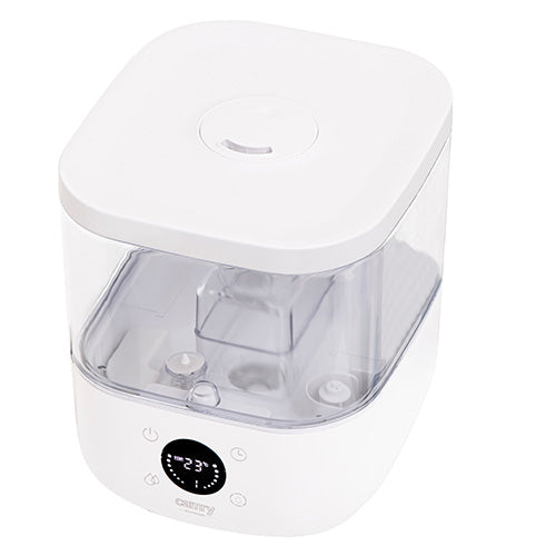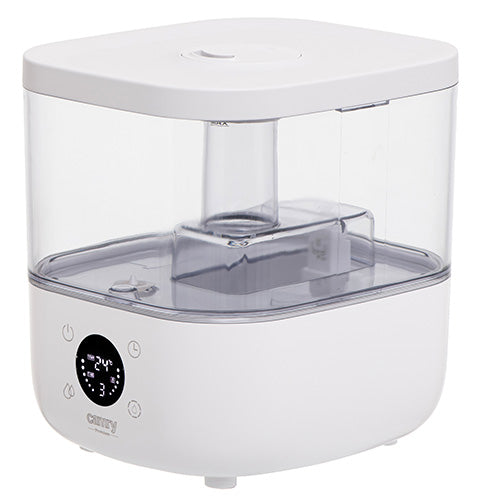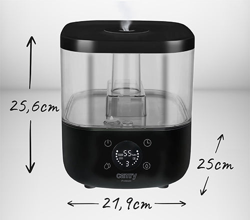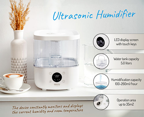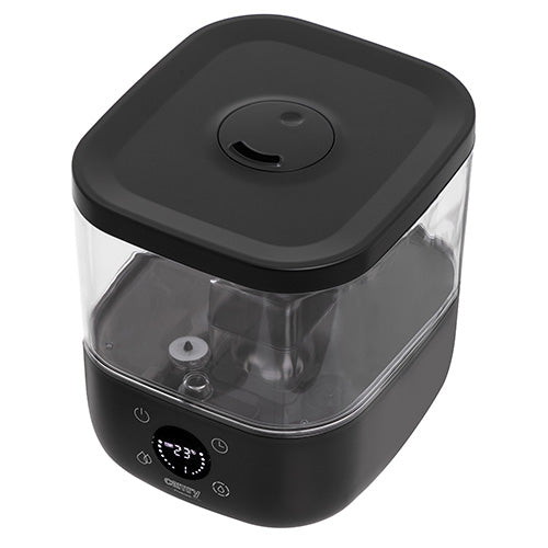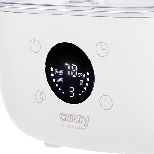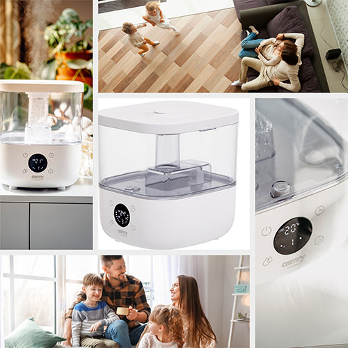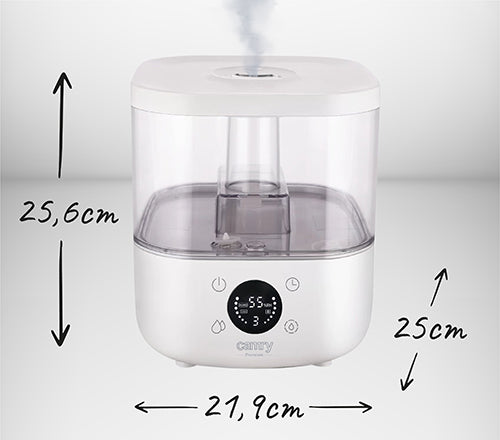 🖥️ Smart og Brugervenlig Betjening Udstyret med et elegant LED-display og touch-knapper, er det let at styre funktioner som timer, fugtigheds niveau og tænd/sluk. Vandtanken på 5 liter fyldes nemt op fra toppen, og displayet viser både fugtighed og temperatur i rummet.