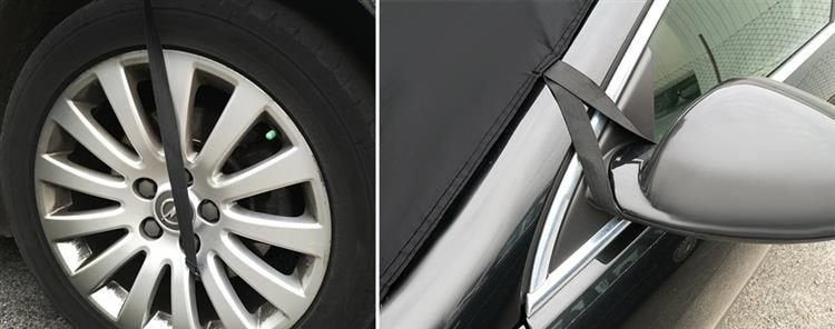 Takket være elastikkerne, som er syet fast til måtten, er monteringen enkel og kræver ingen ekstra værktøjer. Du skal blot kroge den fast på sidespejlene og lukke døren.