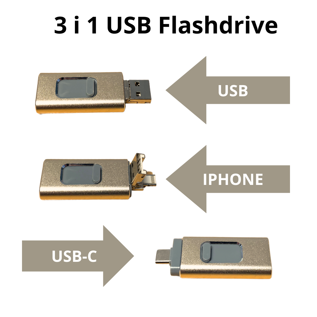 USB Stikket har 3 stik i sig, normal USB, USB-C og Iphone stik. Du kan skubbe den grå knap for at skubbe et andet stik ud af den anden ende af USB stikket. Det normale USB stik der passer i computeren, kan vippes op, sådan at den passer i en Iphone, ligesom på billedet.