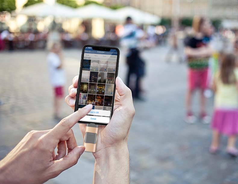 - Sæt USB-flashdriven i din mobil. Gå ind på appen og vælg de billeder, du vil have overført.