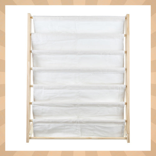 Rensa upp och skapa ordning i ditt barns rum med detta praktiska och snygga "Barnbibliotek med 6 hyllor". Bokhyllan är utformad i barnhöjd, så att ditt barn enkelt kan nå böcker, målarböcker och leksaker – utan hjälp. Med kombinationen av en lätt men stabil träram och mjuka tyghyllor är det en idealisk lösning för både säkerhet och funktionalitet.