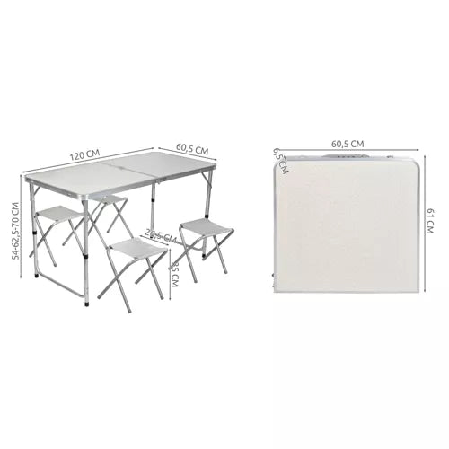 Vårt "Campingset med justerbart bord och 4 stolar" är det perfekta valet för dig som letar efter en praktisk och bekväm lösning för utomhusaktiviteter som kombinerar enkel installation, bärbarhet och hållbarhet.