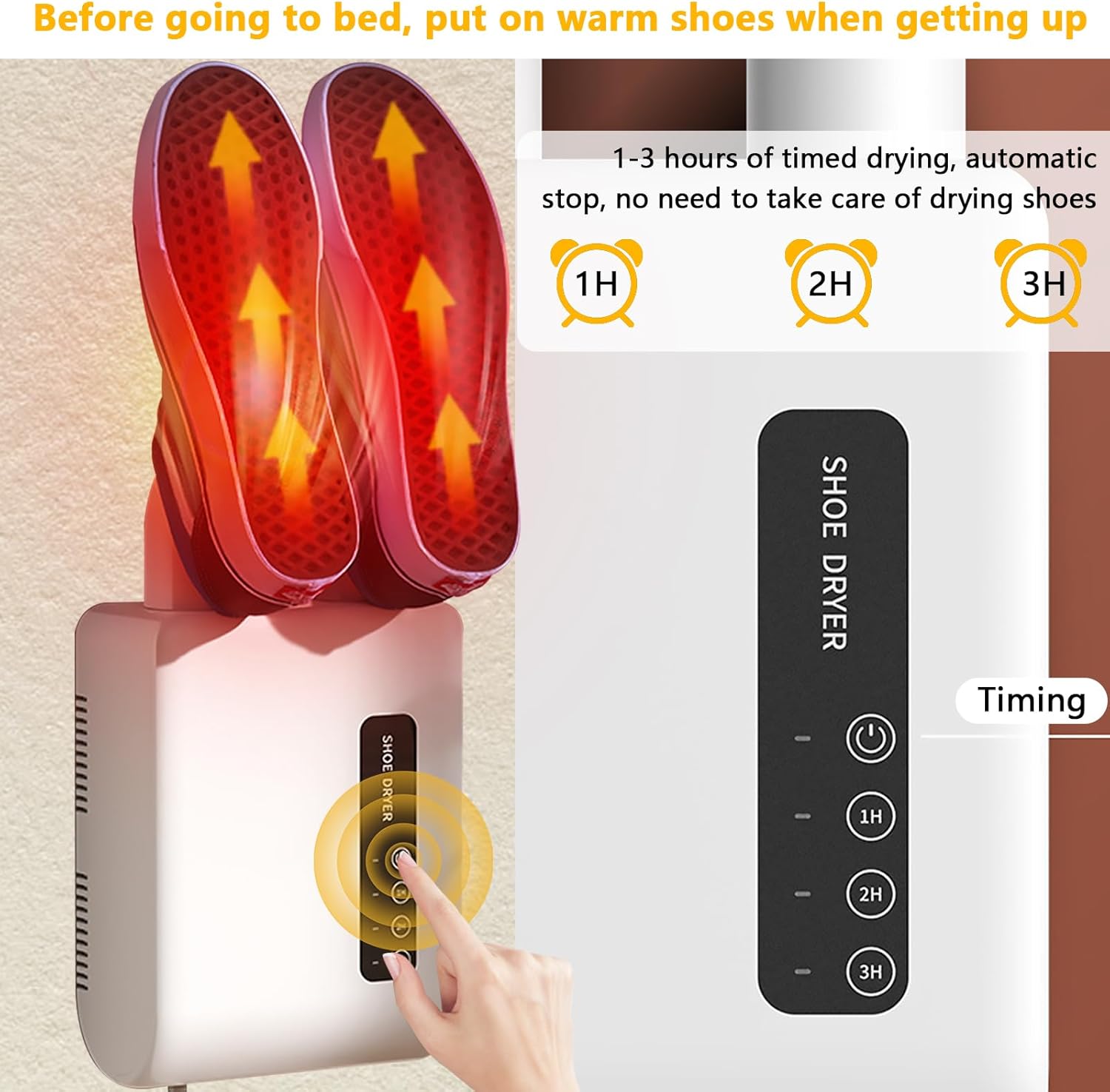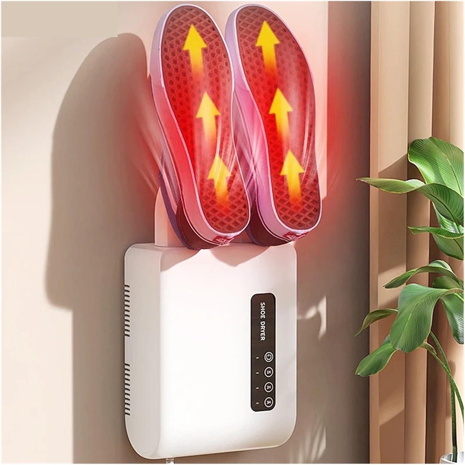 Säg adjö till blöta och kalla skor med denna smarta "Elektriska Sko- och Fotvärmare med Timer". Perfekt för både hemmet och kontoret, den väggmonterade värmaren säkerställer snabb torkning av skor, handskar och mer - samtidigt som den sparar energi och eliminerar obehagliga lukter.