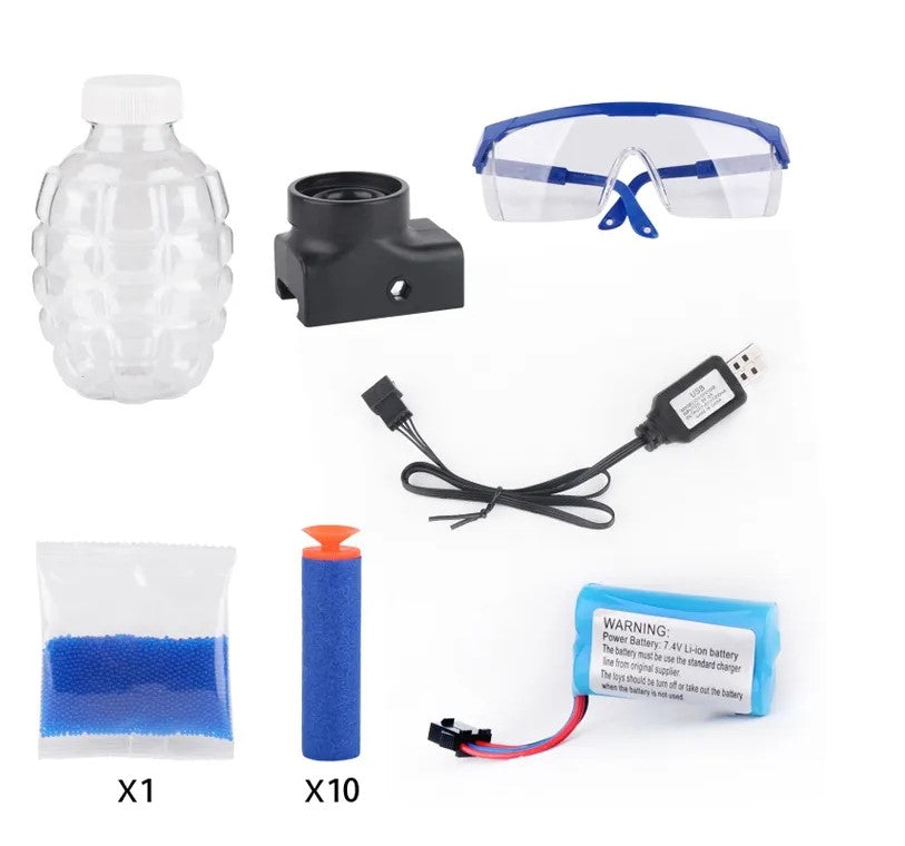 Lista över tillbehör Skyddsglasögon: 1 st Gelkulor: 1 påse (5000 enheter) USB-laddningskabel: 1 st Litiumbatteri: 1 st (7,4V) Mjuka bollar: 10 st Fjäderflaskanslutning: 1 st Kulflaska: 1 st