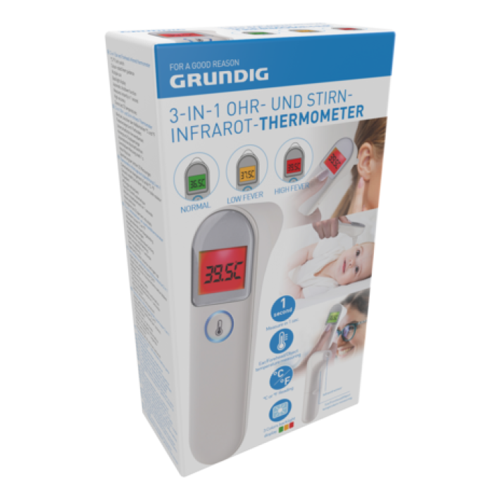 Med "Grundig Infrared Thermometer 3-in-1" får du ett pålitligt och hygieniskt sätt att mäta kroppstemperatur, perfekt för både hemmet och professionellt bruk. Njut av hög precision och användarvänlighet med denna avancerade termometer.