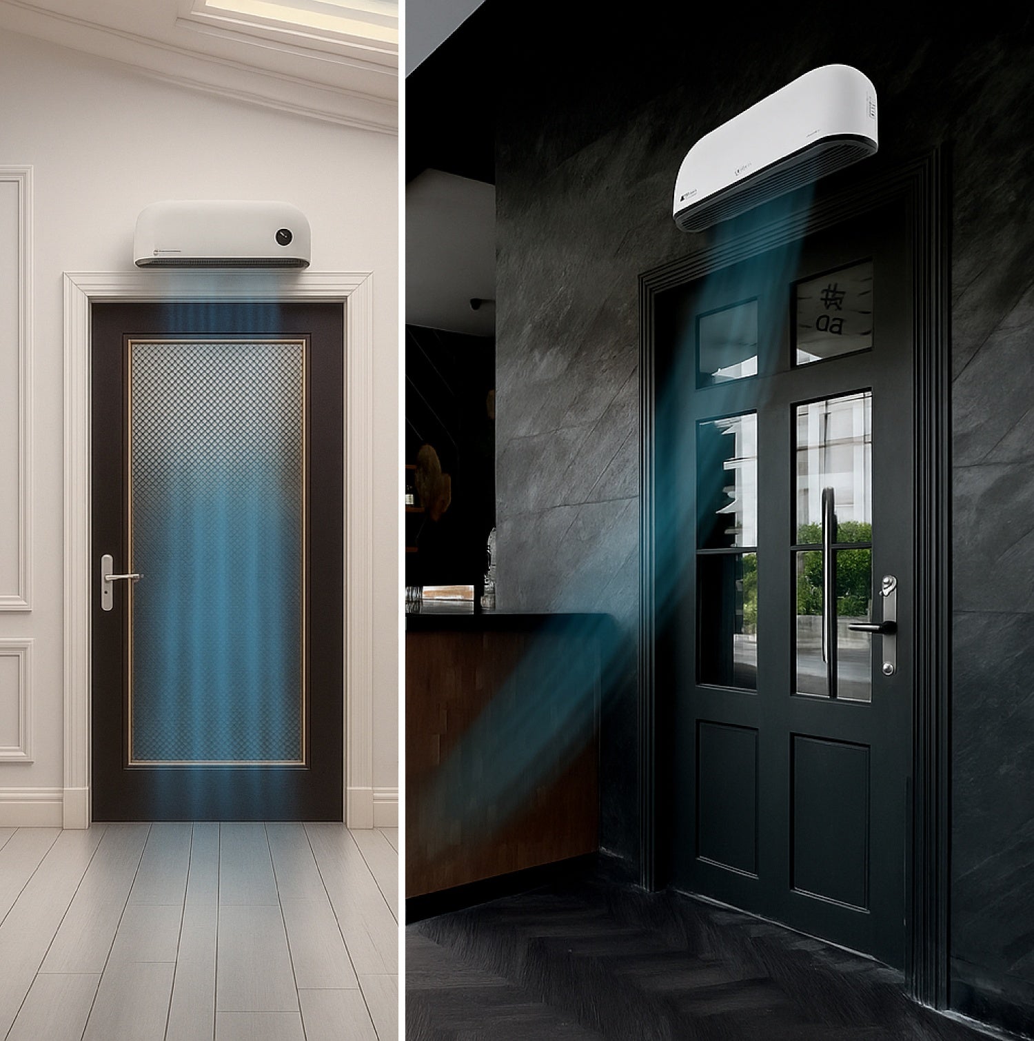 Det klare LED-display gør det nemt at aflæse og justere indstillingerne direkte på enheden eller via fjernbetjeningen. Elegant design til vægmontering, der passer ind i ethvert rum.