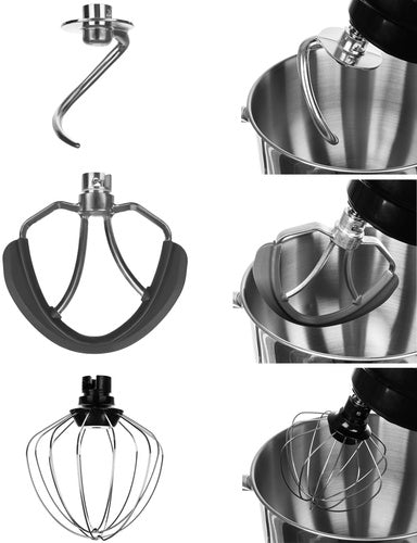 🧁 GRATIS tillbehör ingår Förutom de tre standardverktygen (degkrok, visp och flatvisp) ingår ett komplett dekorationsset med spritspåse och 24 munstycken , äggseparator och degskrapa – perfekt för både bakning och dekorering.
