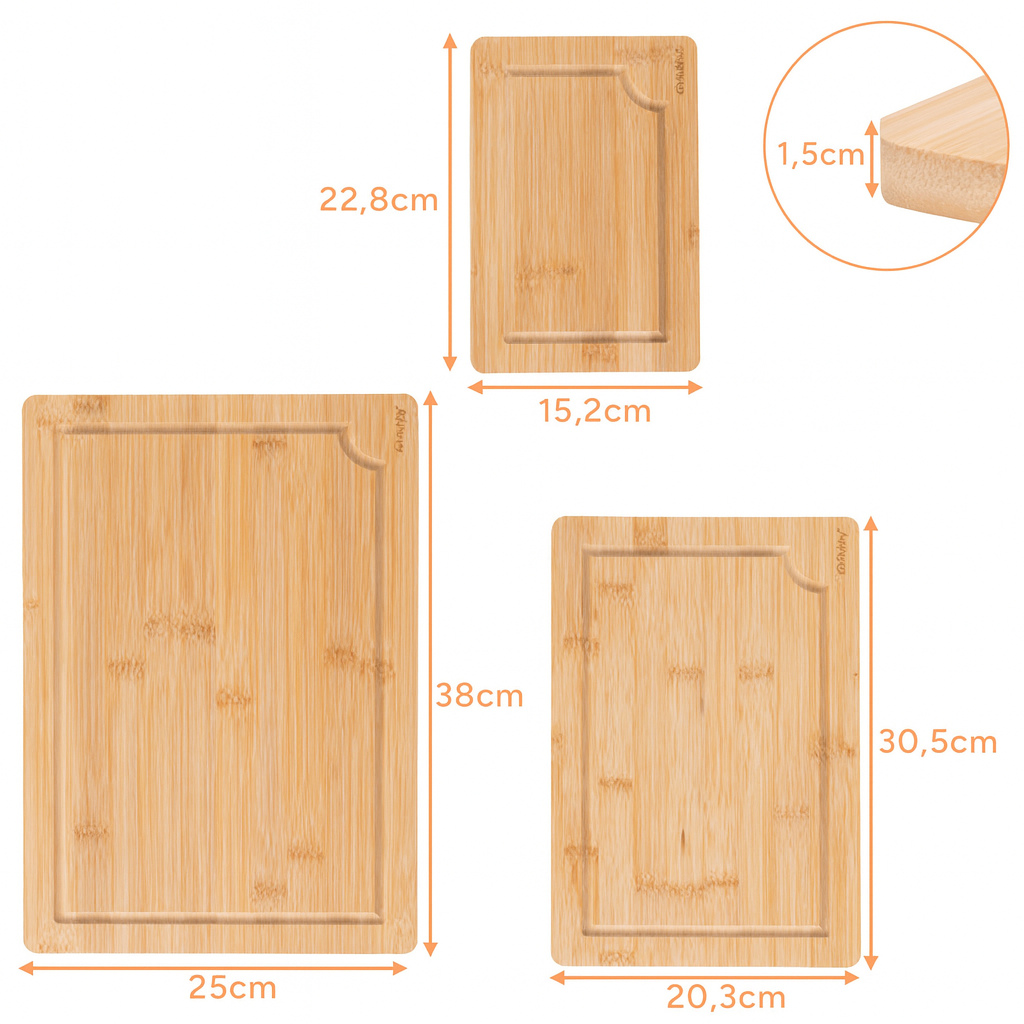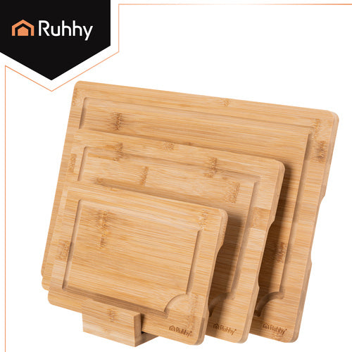 Skärbrädsset Bambu 3-i-1 med Hållare – Flera Storlekar och Saftrännor
