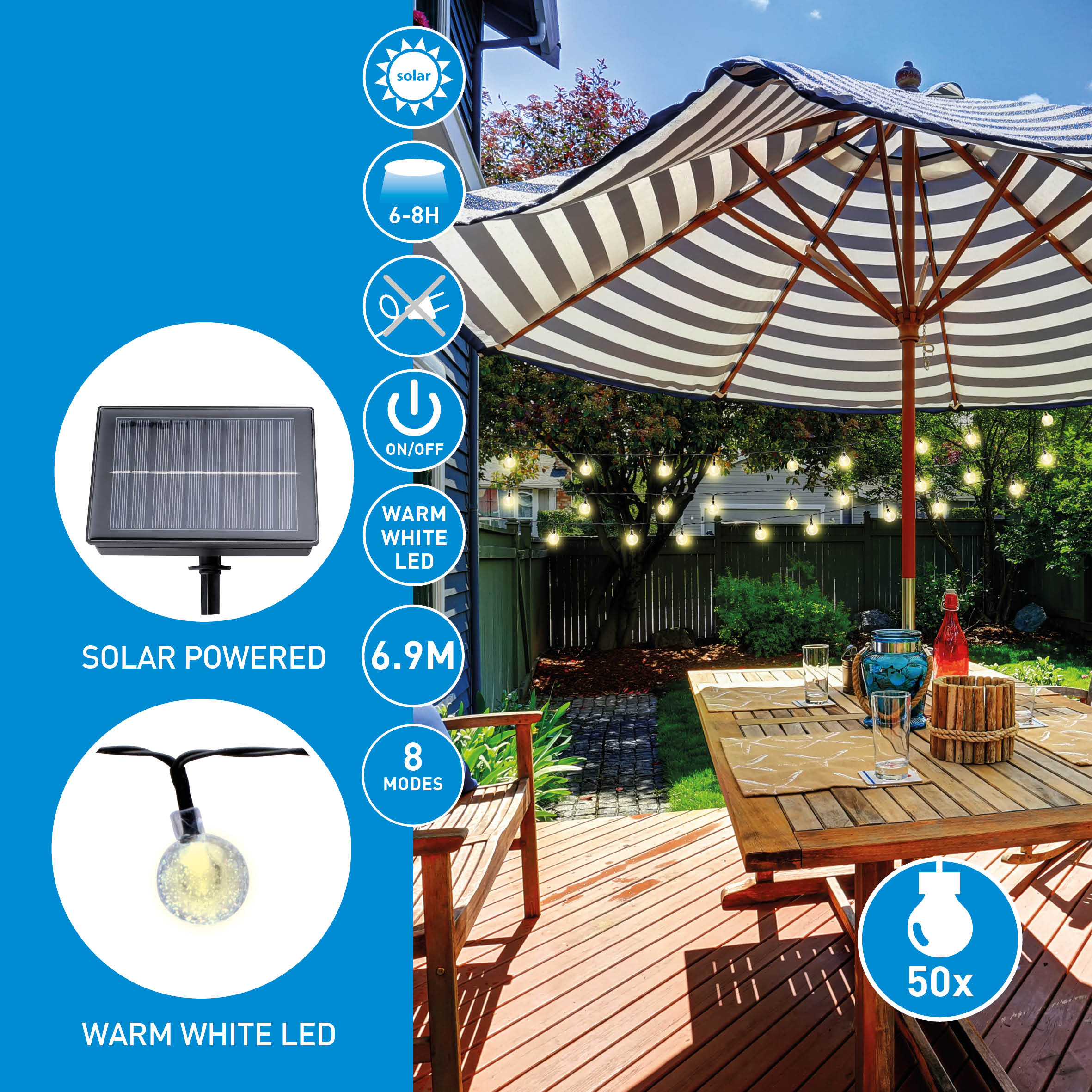 Upplev den perfekta kombinationen av energieffektivitet och miljövänlighet med Grundigs solcellsdrivna ljuskedja. Med 50 varmvita lampor och en längd på 6,9 meter är denna ljusslinga idealisk för att skapa en mysig atmosfär i alla utomhusmiljöer.