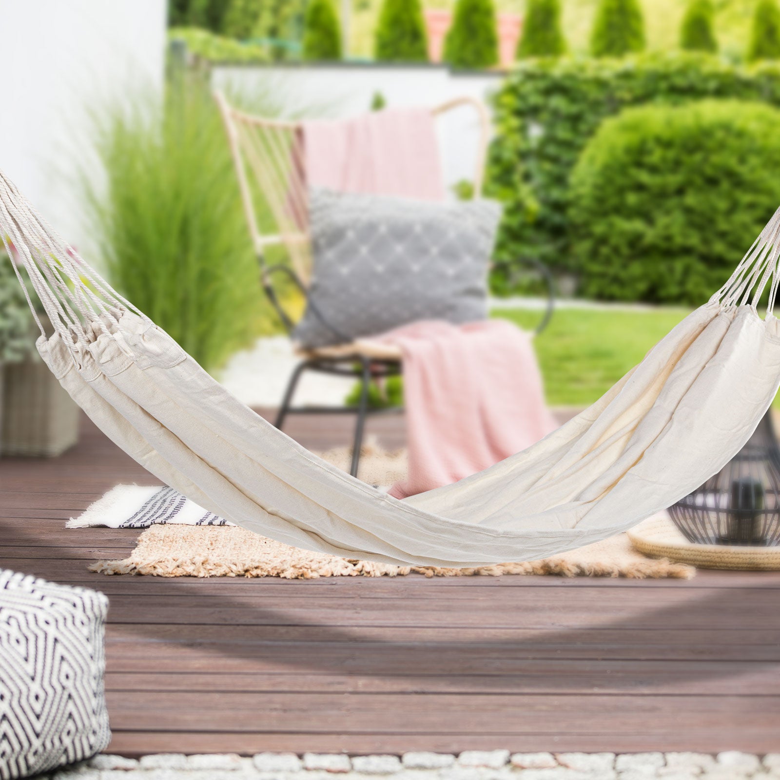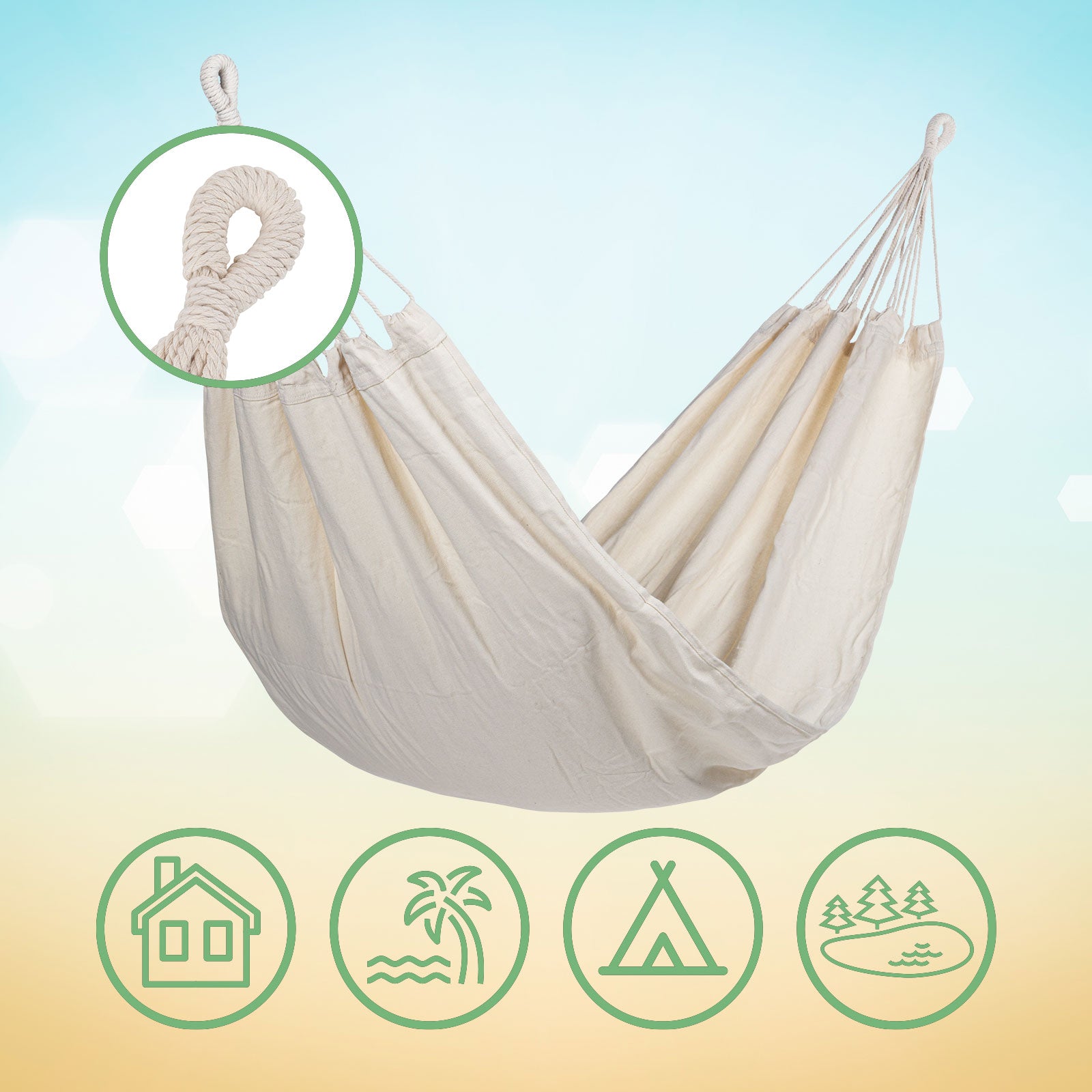 🌿 Perfekt för utomhusbruk Oavsett om du är i din trädgård, på en camping eller på en terrass, ger denna hängmatta ett perfekt tillfälle att koppla av och njuta av det fina vädret.