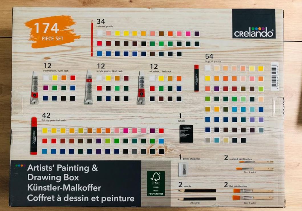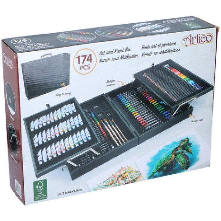Släpp lös din kreativitet med detta kompletta "Stora målarset i trälåda", som innehåller hela 174 delar! Perfekt för både barn och vuxna som älskar att rita, måla och uttrycka sin konstnärliga sida – allt förpackat i ett vackert och praktiskt trälåda.