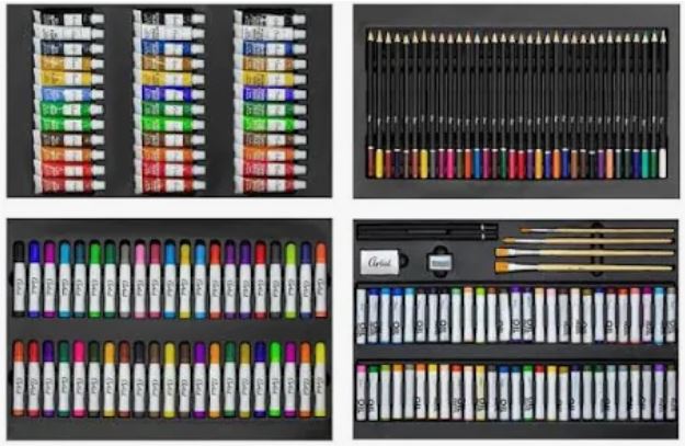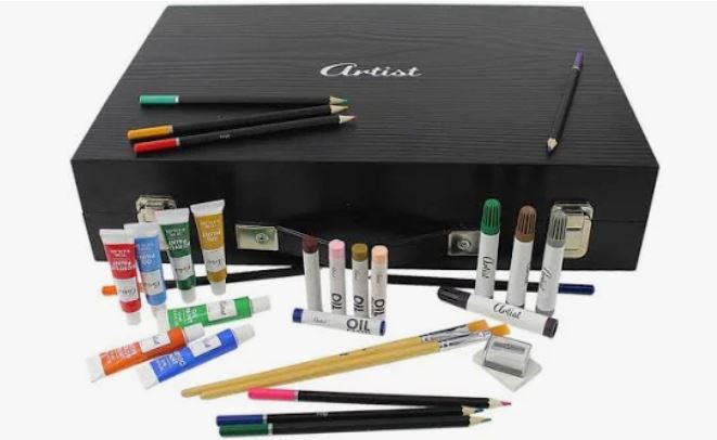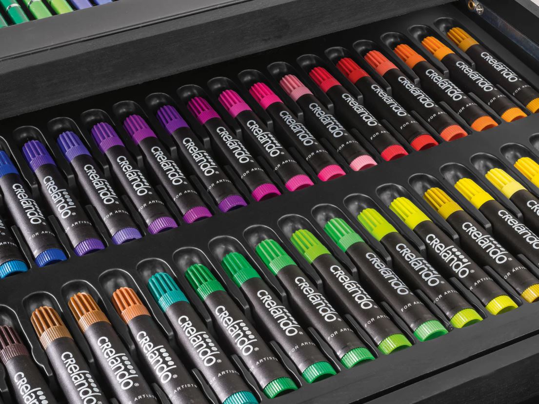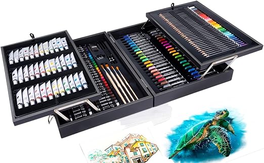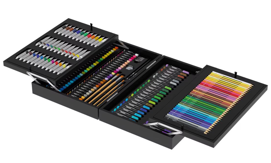 🎨 Allt du behöver i en resväska Med färgpennor, tuschpennor, oljepasteller, akvareller och mer finns det tillräckligt med verktyg för timmar av kreativ underhållning. Oavsett om du föredrar att rita eller måla hittar du allt här.