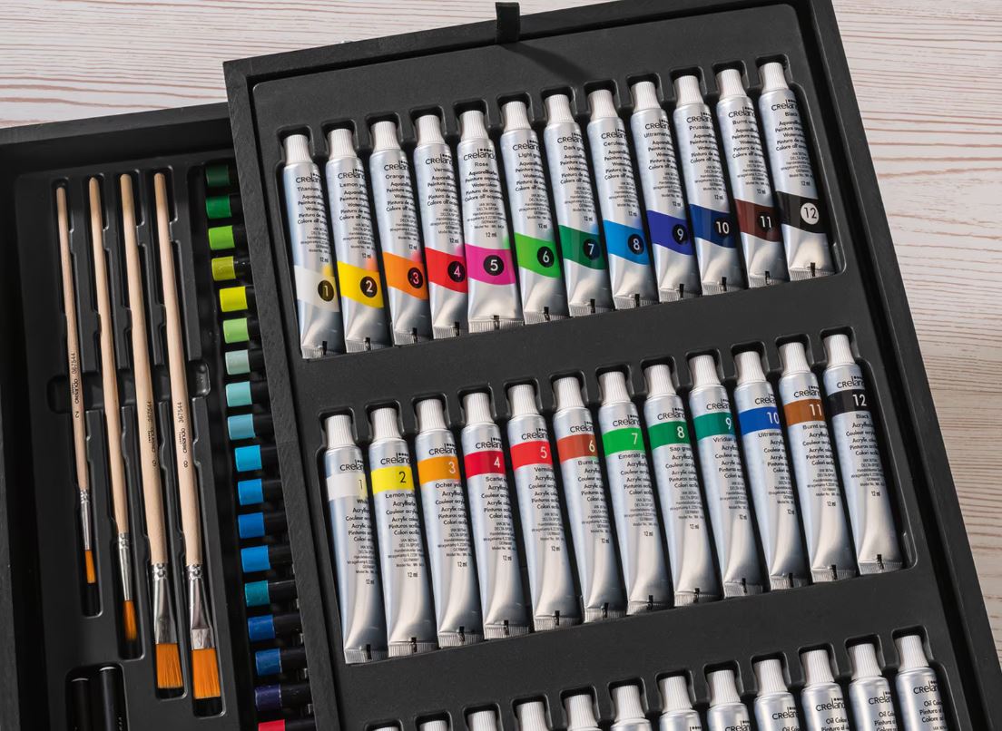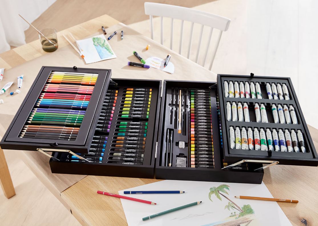 Med detta "Stora målningsset i trälåda" får du allt du behöver för att skapa små och stora konstverk – organiserade, inspirerande och redo att användas.