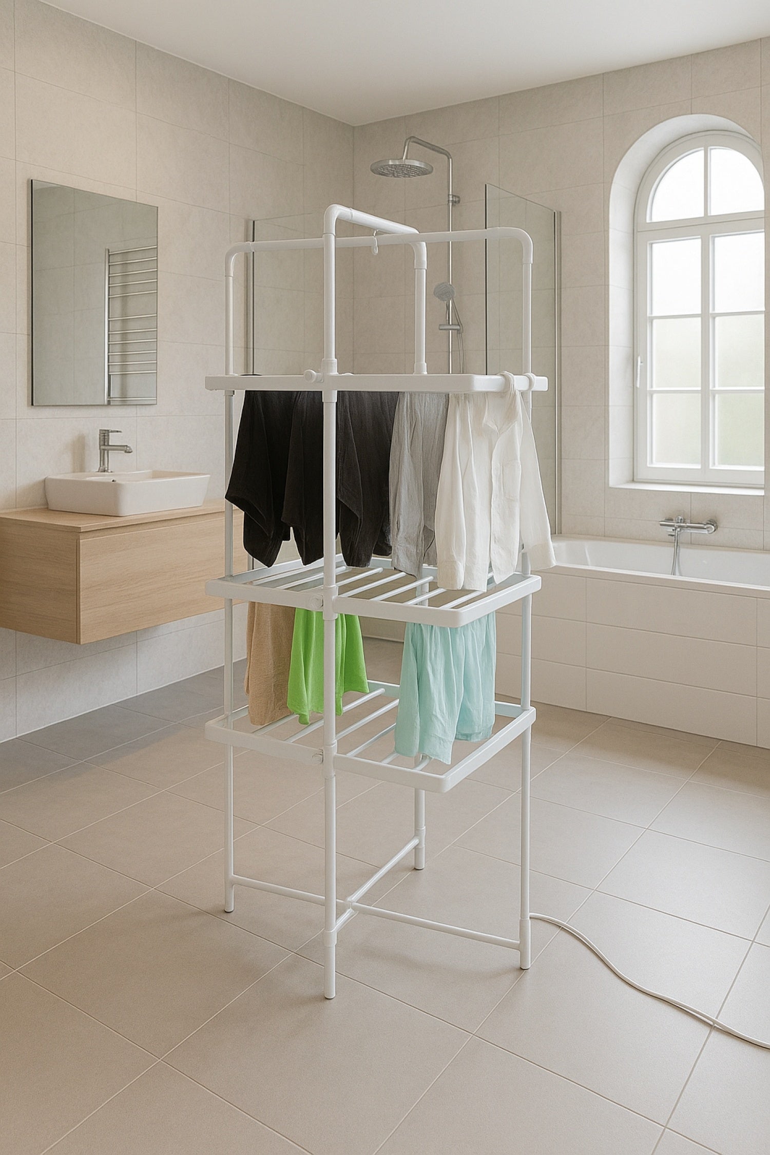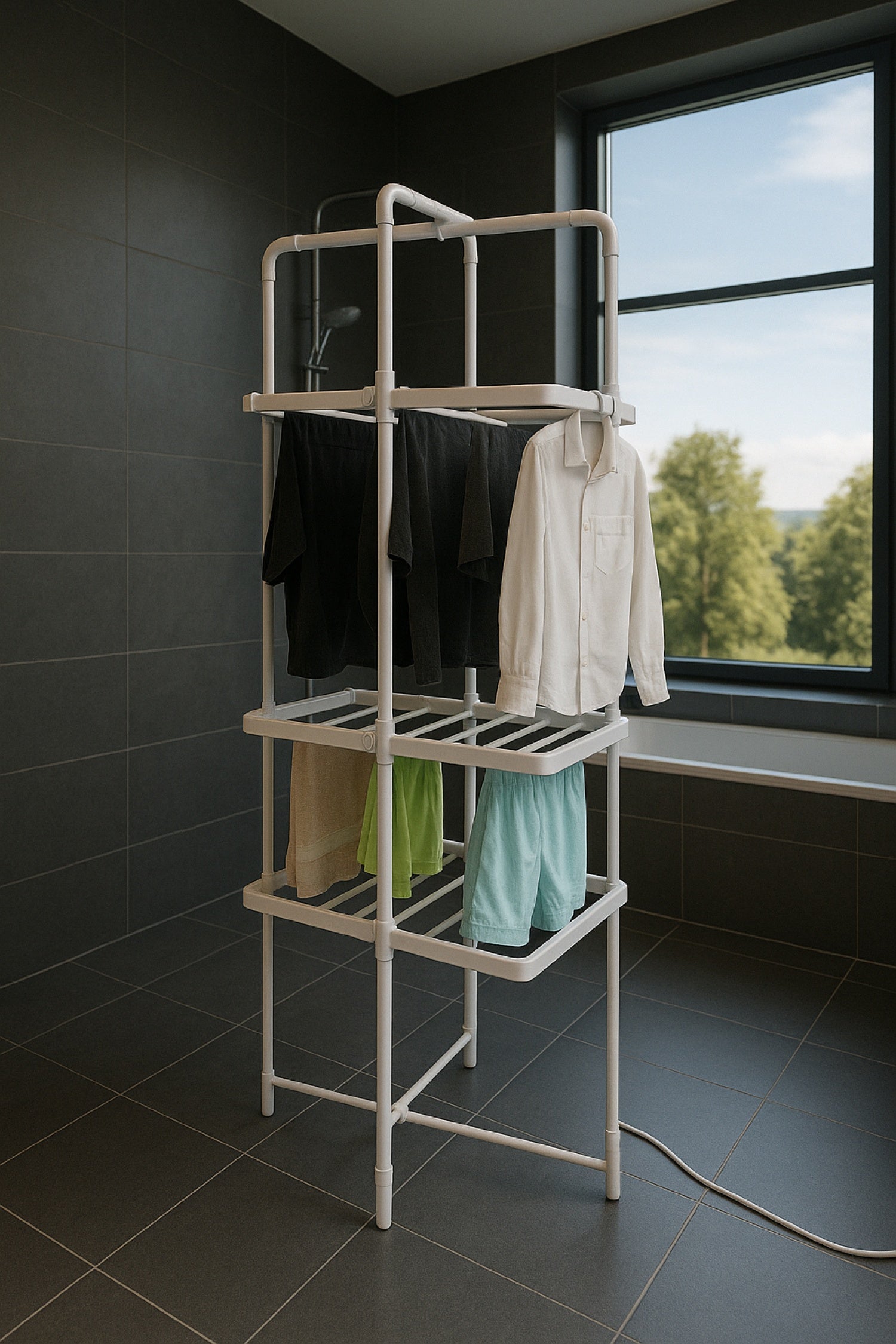 🔌 2-i-1-funktion Använd den som en elektrisk torklösning med värme – eller som en vanlig torkställning utan el. Du väljer, beroende på dina behov och energiförbrukning.